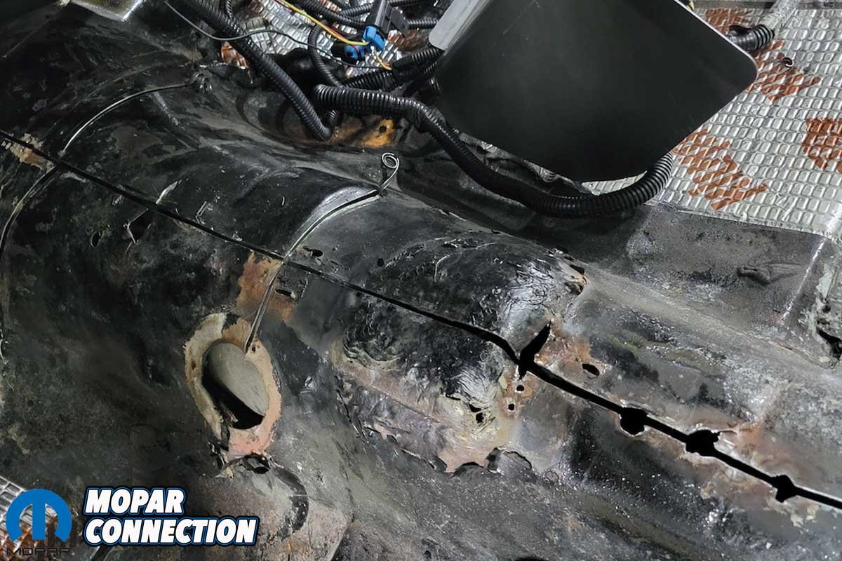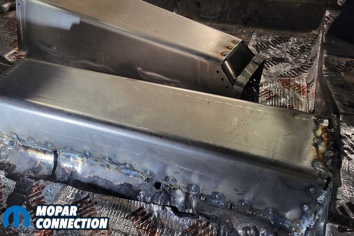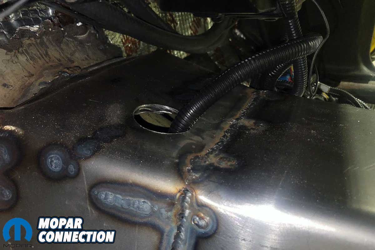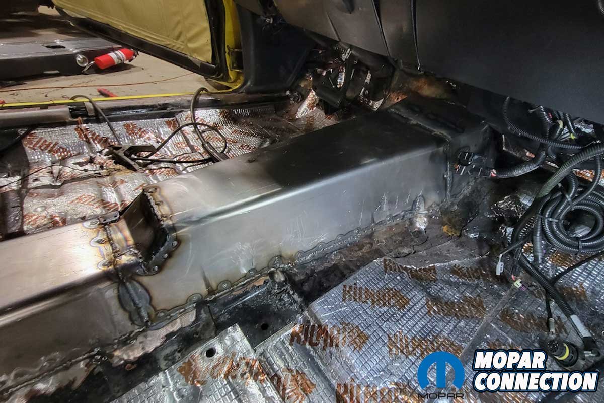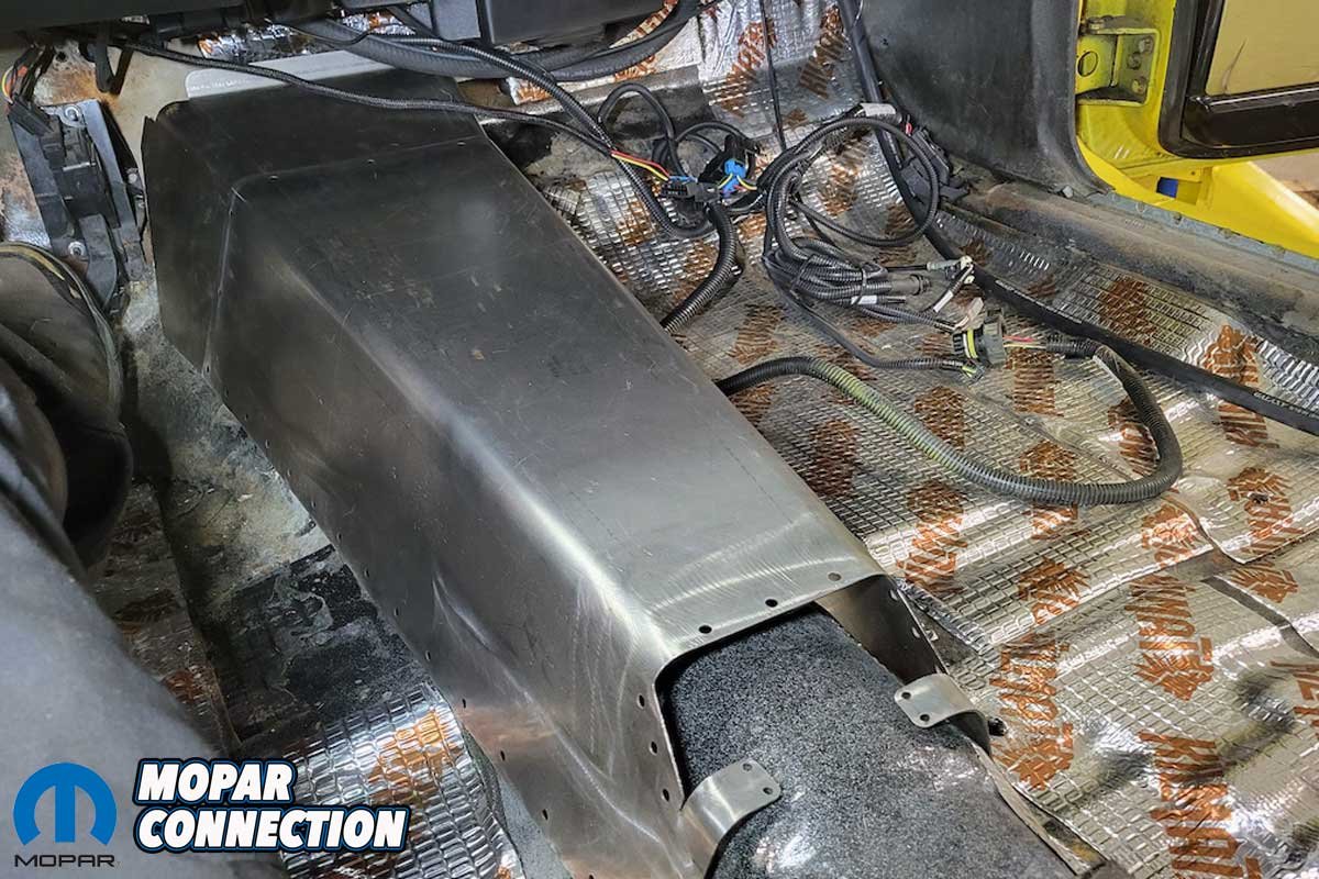 The installation required basic hand and power tools, welding equipment, a drill and bit to make an access hole in the tunnel cover for the wiring harnesses, and a seam sealer. The cover is designed for extreme chassis Mopar setups, guaranteeing a tailored fit.