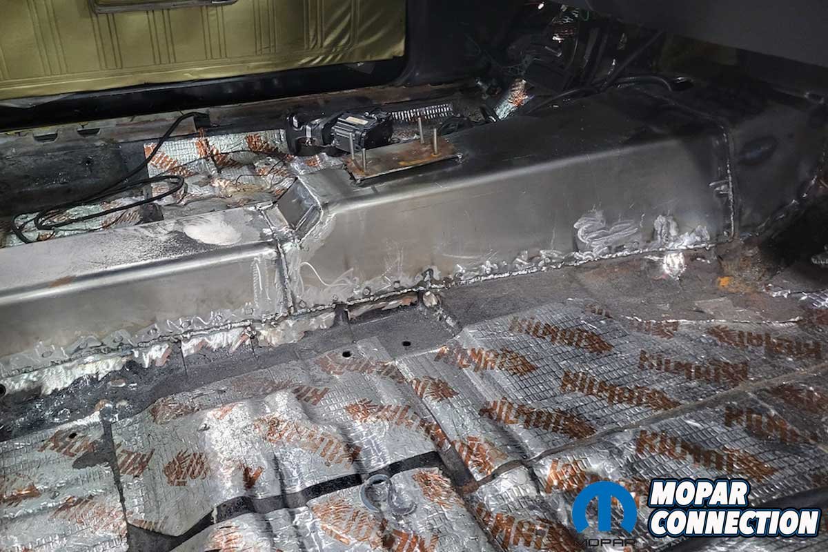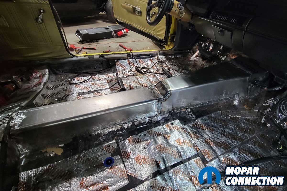 Above: Rather than using sheet metal screws or rivets to secure the tunnel kit, we welded the three panels to each other and the floor of the Super Bee.