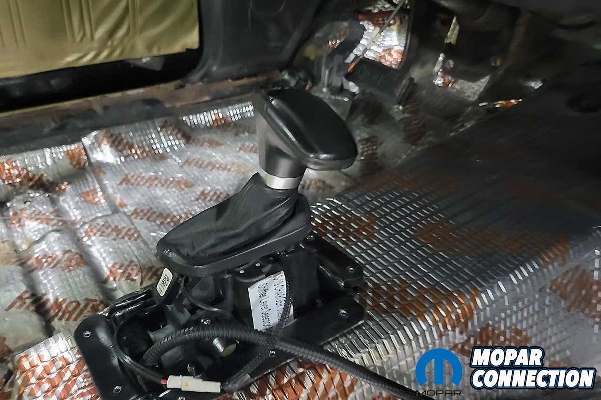 With the shifter sufficiently positioned, we drilled a 1-inch hole in the transmission tunnel under the dash for the wiring harness. The hole’s location under the dash made it nearly undetectable, and when the console was installed, the hole would be hidden. A grommet was installed to protect the harness and finish the hole.