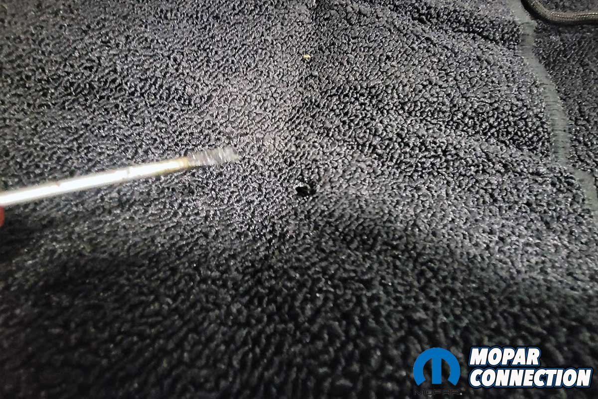 We located the mounting holes for the seat brackets and belt bolts. Then, we heated a screwdriver shank and pushed it through the carpet at each hole. The screwdriver melted the carpet, ensuring it would not fray when the components were secured.