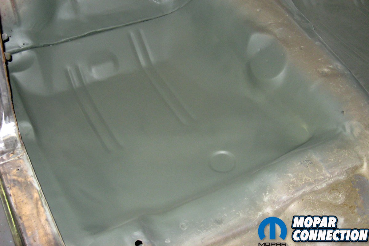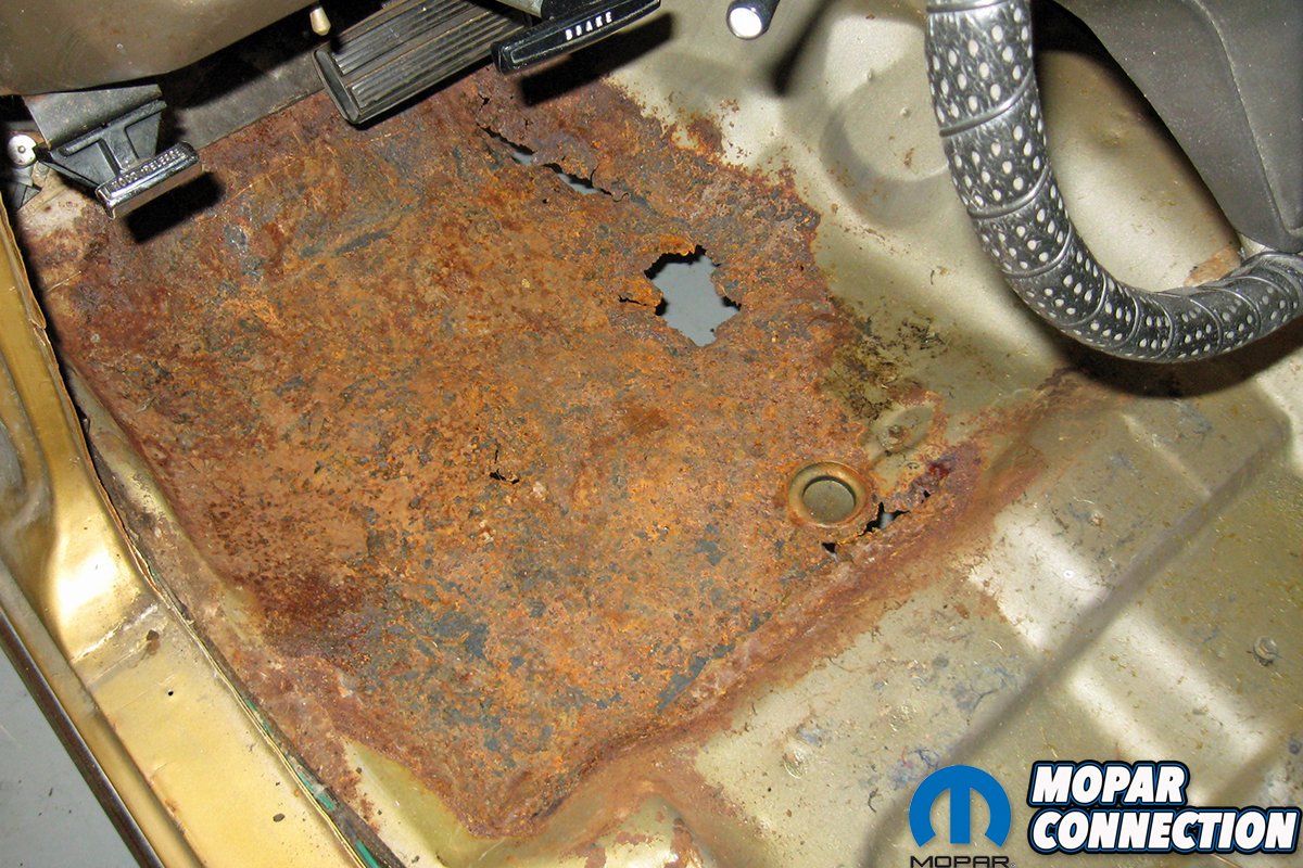Above left: This is a floor pan of a 1975 Dodge Dart. The floor pan is badly damaged, so the removal of the damaged area is required. Without access to a MIG welder and the skills required to use the welding unit, this work would have to be farmed out to someone with the welding skills to make the repair. Above center: The rusted floor was cut out of the Dart, and all the unibody structure was cleaned and treated for rust. A coating of weld-through primer was sprayed to the treated metal before the new floor was welded in place. To ensure the floor pan was properly welded to the unibody structure, pressure was applied to the floor pan next to each plug weld via a wooden hammer handle. The weld bead was run down the transmission tunnel to affix the floor pan to the original floor. Above right: After sanding the weld areas smooth and applying epoxy primer, the floor looks like a factory piece. A 130XP provided all the weld beads to the floor pan in 2008. After ten years of driving the Dart, the floor pan has remained intact with zero cracking or damage occurring.