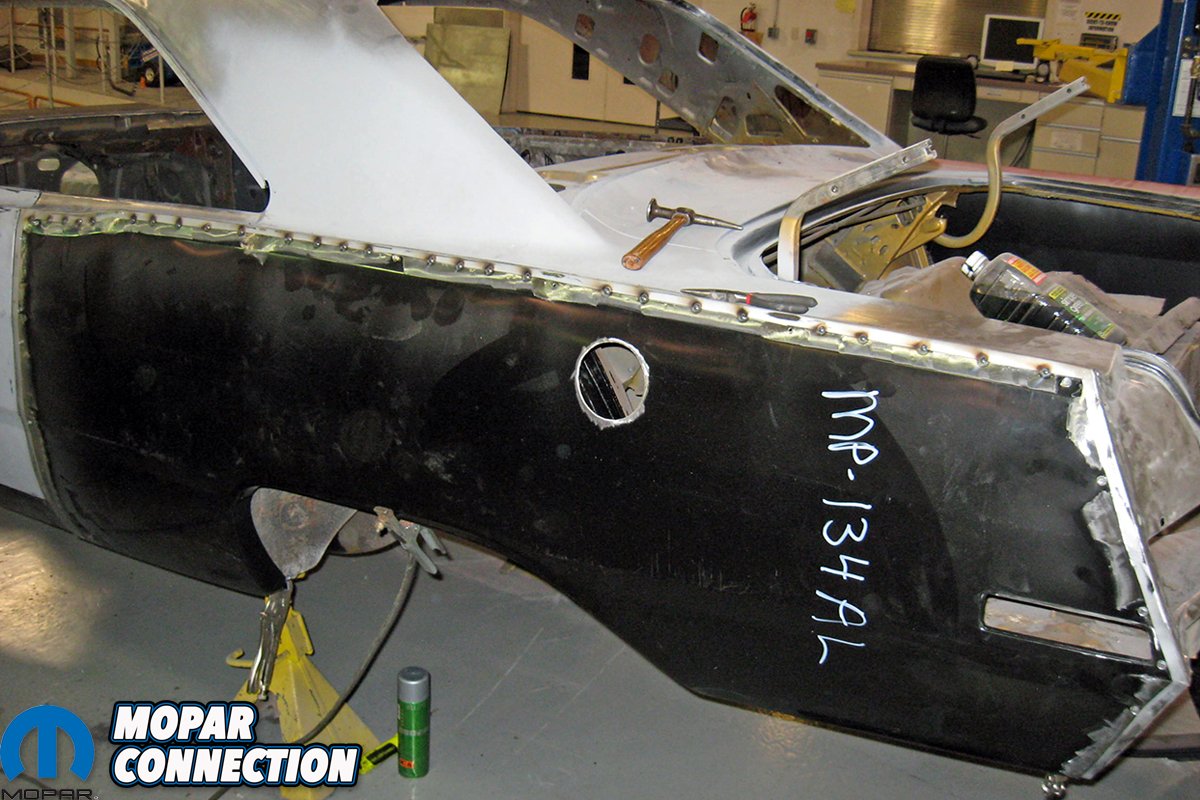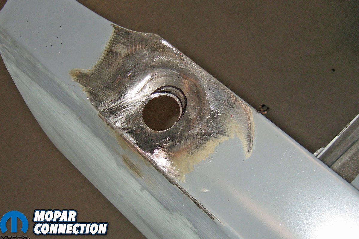 Above left: Another area on the Dart that was damaged was the antennae hole in the passenger fender, so a large washer was MIG welded to the under side of the fender. The large washer’s center diameter was still too great for the base of the antennae, which required a second smaller center diameter washer to be welded to the large washer. The two beads can be seen in the photo. Above right: With the washers welded to the underside of the fender, a properly sized antennae hole was drilled from the top side of the fender. The proper penetration of the welds held the washers in place, and the washers were treated for rust corrosion during the painting process.