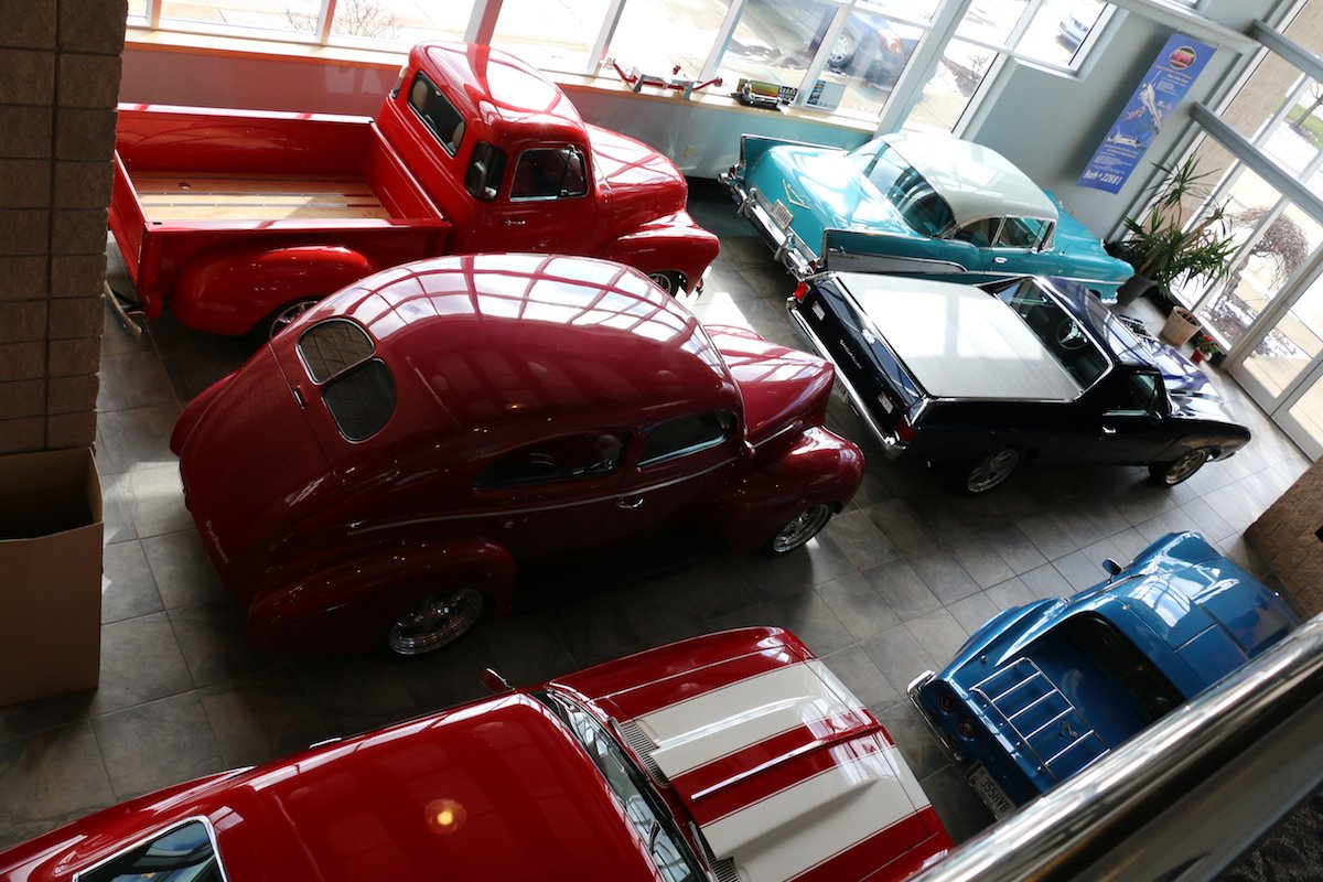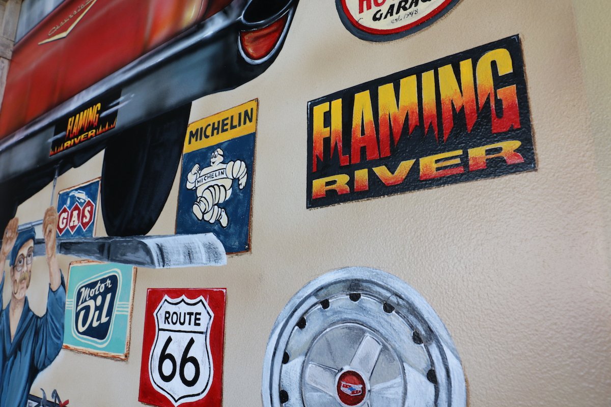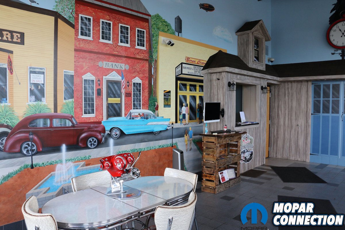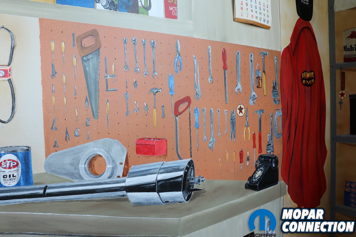 Upon arrival at Flaming River Industries (FR), you are greeted by one of two showrooms. Whether you’re picking up parts or there for business, you may get to walk through Jeanette’s collection of shop vehicles or walk into a custom hand-painted room. We went to the first door we saw and it happen to be the parts pickup area. As we entered, we were astonished at the hand-painted murals. Although the room is not very big, the detail and list of hidden objects that you could find throughout the painting is incredible. We later found out that the painters of the room are actually a husband and wife team that are employed at FR and took them 6 months to complete.