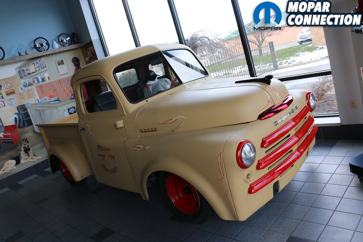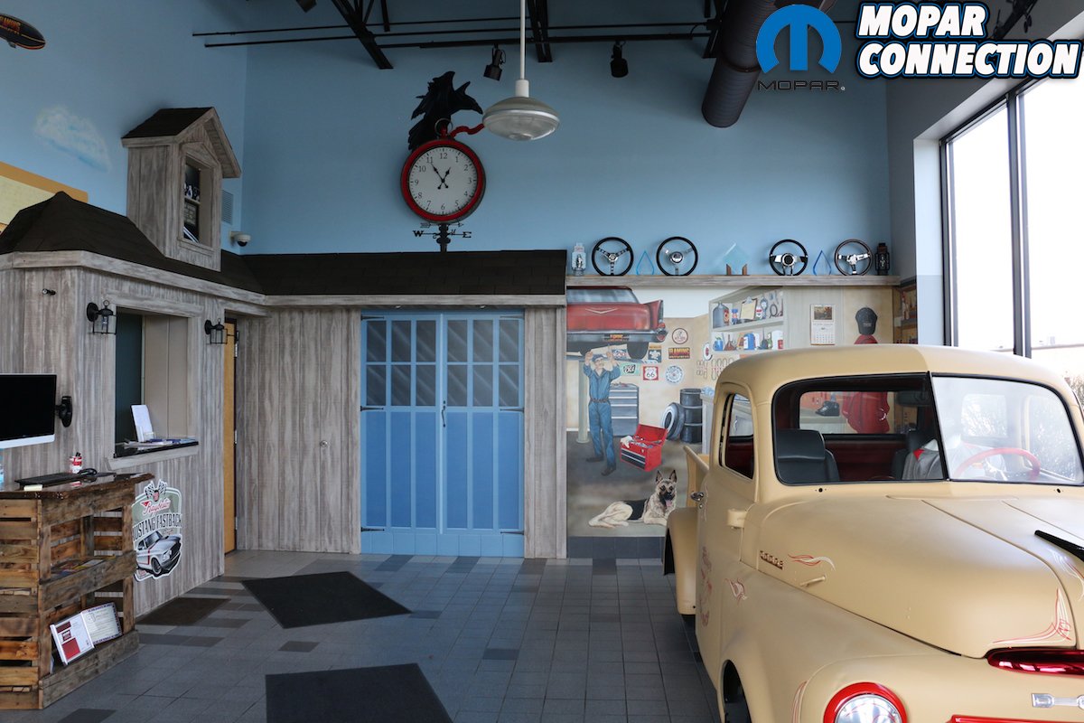 Hidden throughout the hand-painted walls was Flaming River signs, spark plugs, shop cars and many other automotive related items to find. They also had a few parts on display in the room along with a 1950 Dodge truck that was easy on the eyes. We expected to see a Chevy or Ford on display but we were very grateful that they sat out their Dodge just for us. (We don’t think they did that just for us but seeing a Dodge in their showroom made our day.)
