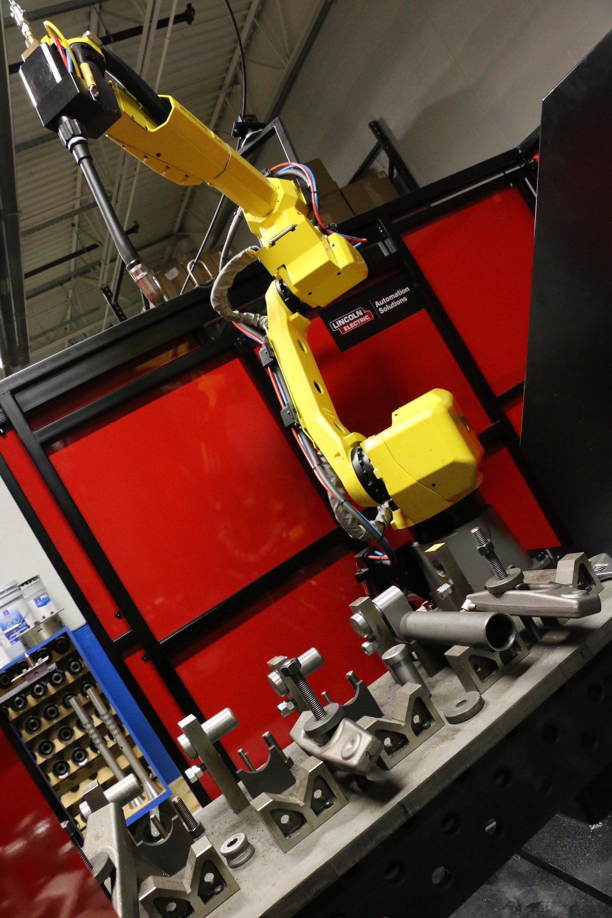 Above left: Welded steering column tubes stack up behind the robotic arms
