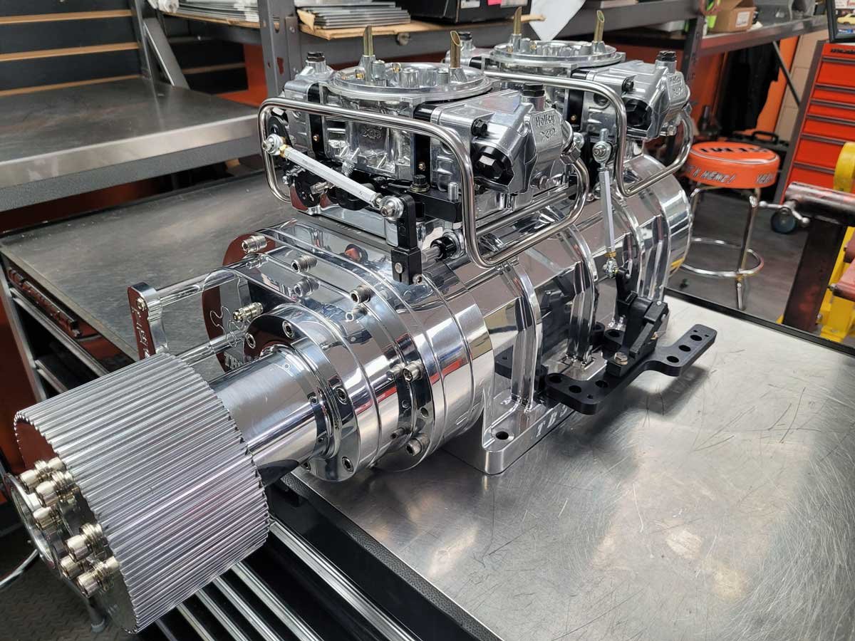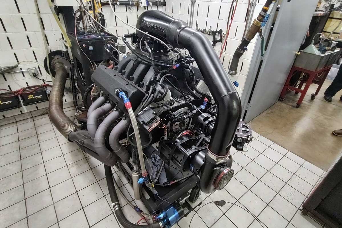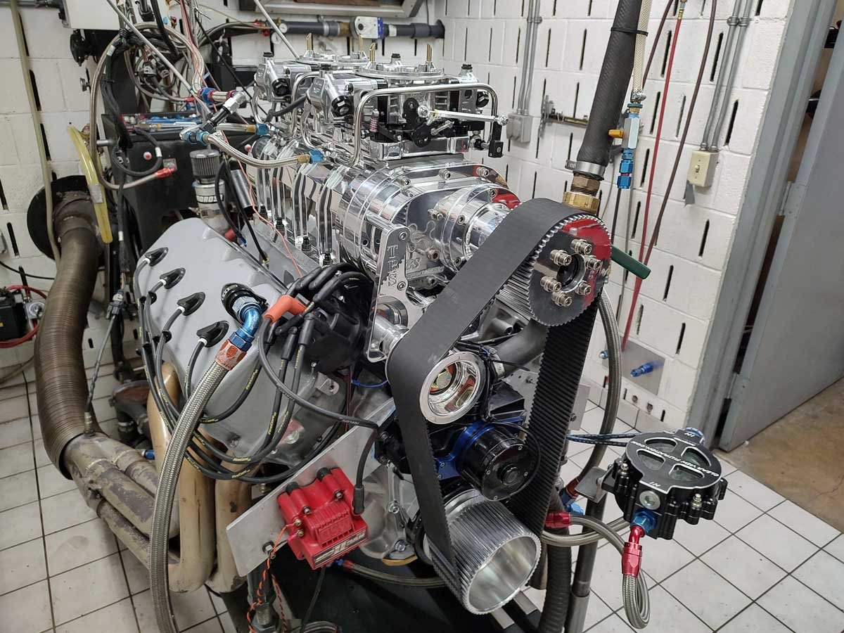 An APD billet 1750 CFM alcohol carburetor flows fuel at 6 to 9 psi. A custom race oil system keeps the engine internals lubricated. The engine is finished with a blacked-out appearance. The supercharged wedge produces 1373 hp at 7400 rpm and 1150 lb-ft of torque at 6200 rpm. The engine will easily propel a door car to 4.55 seconds or a dragster to 4.35 seconds in the eighth mile.