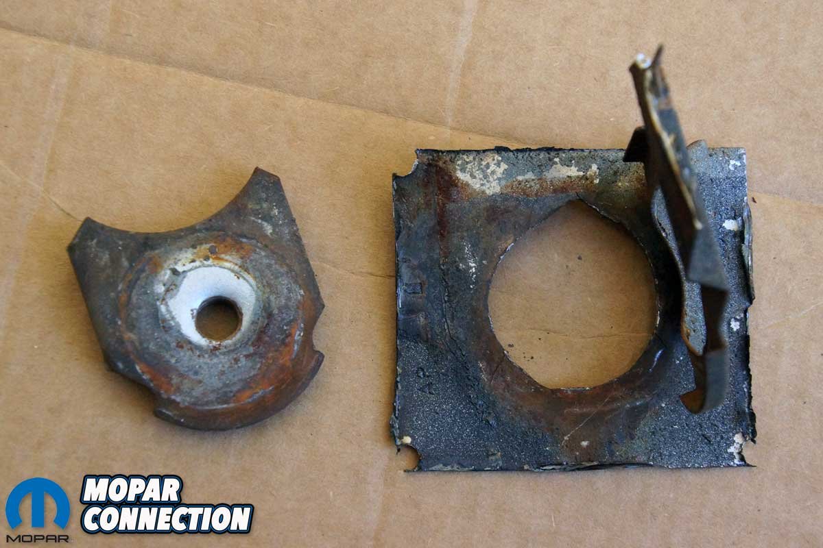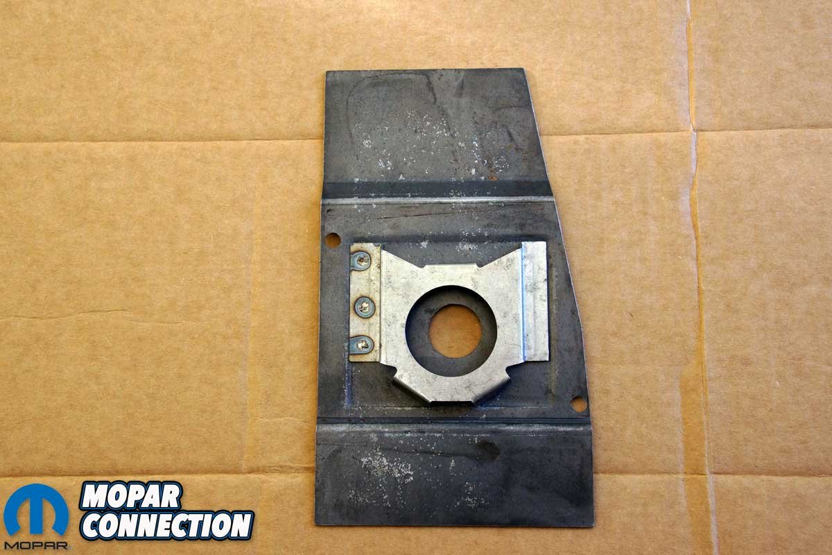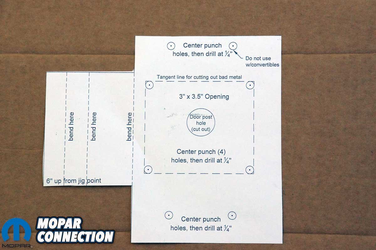 Above Left: Classic Industries offers driver- and passenger-side door jamb repair kits for ’67-’76 A-Bodies. The instructions and a template are included with each kit. Above Right: The 0.062-inch-thick repair plate has a provision for the support nut, which is transferred from the original door jamb.