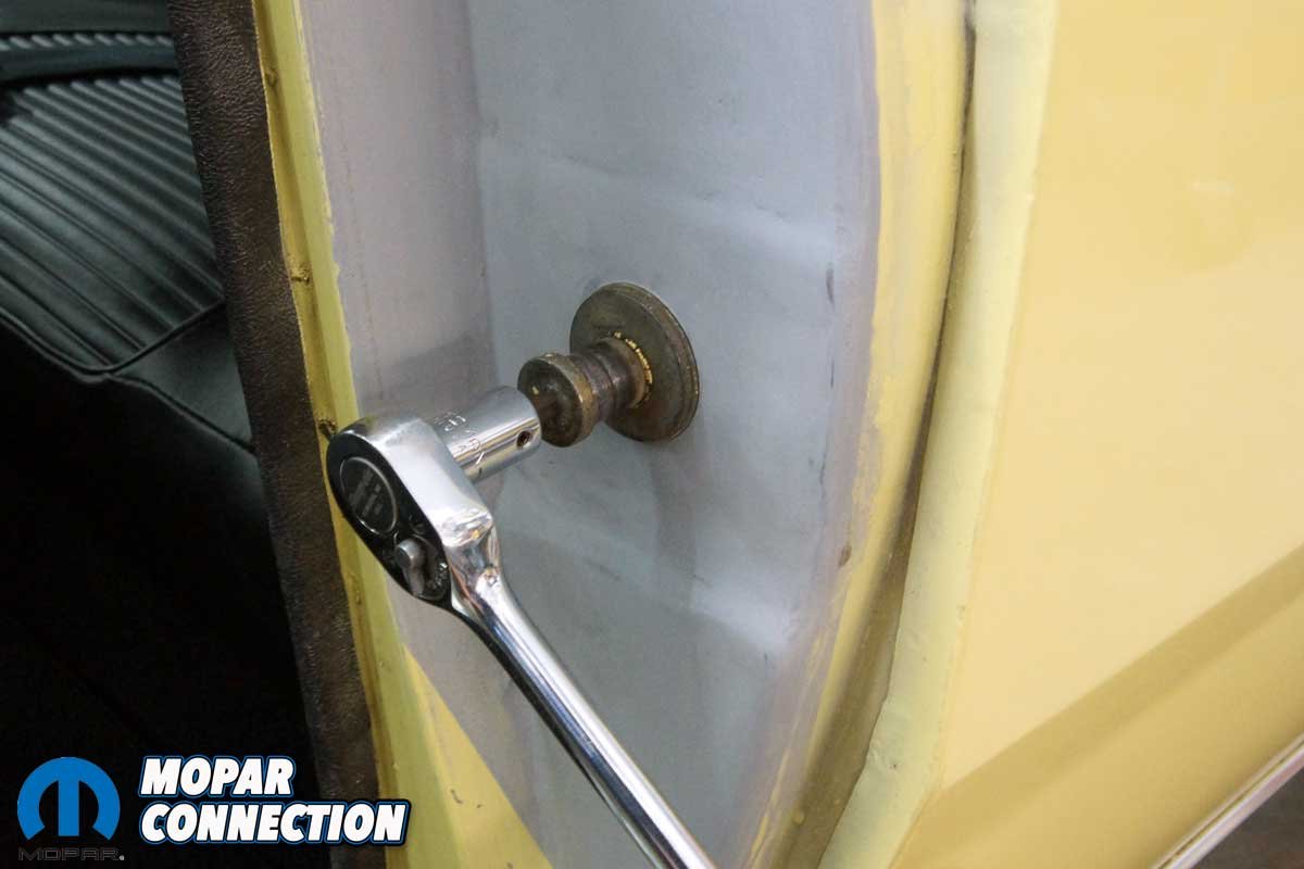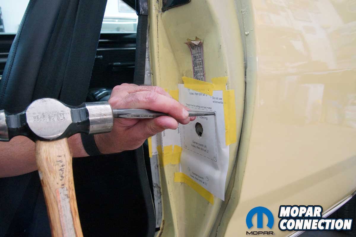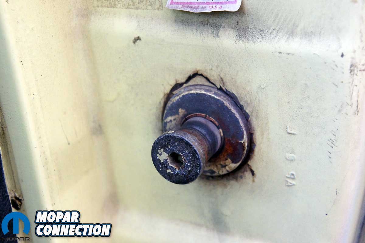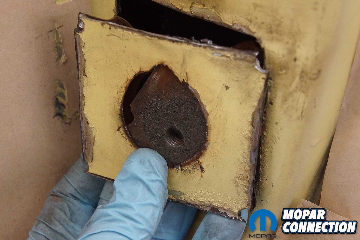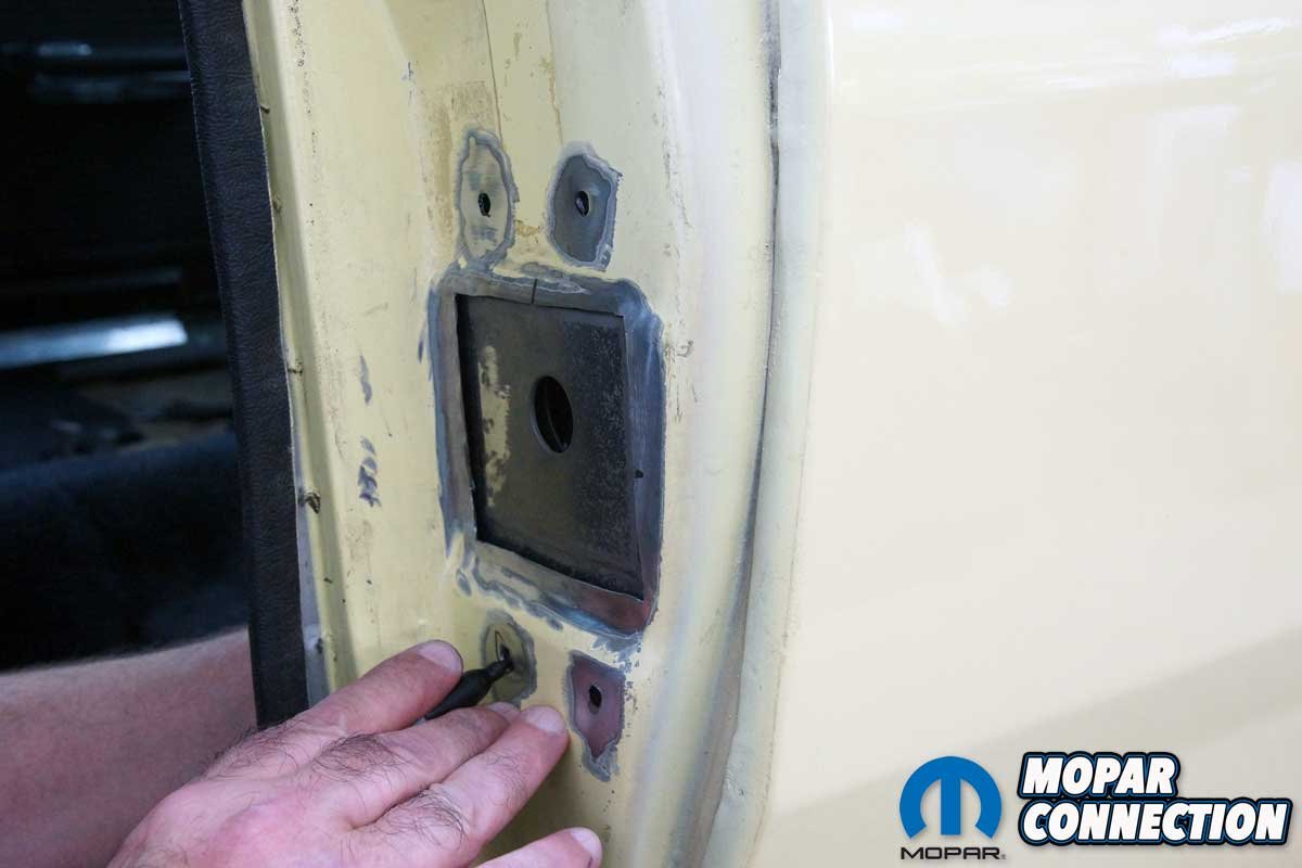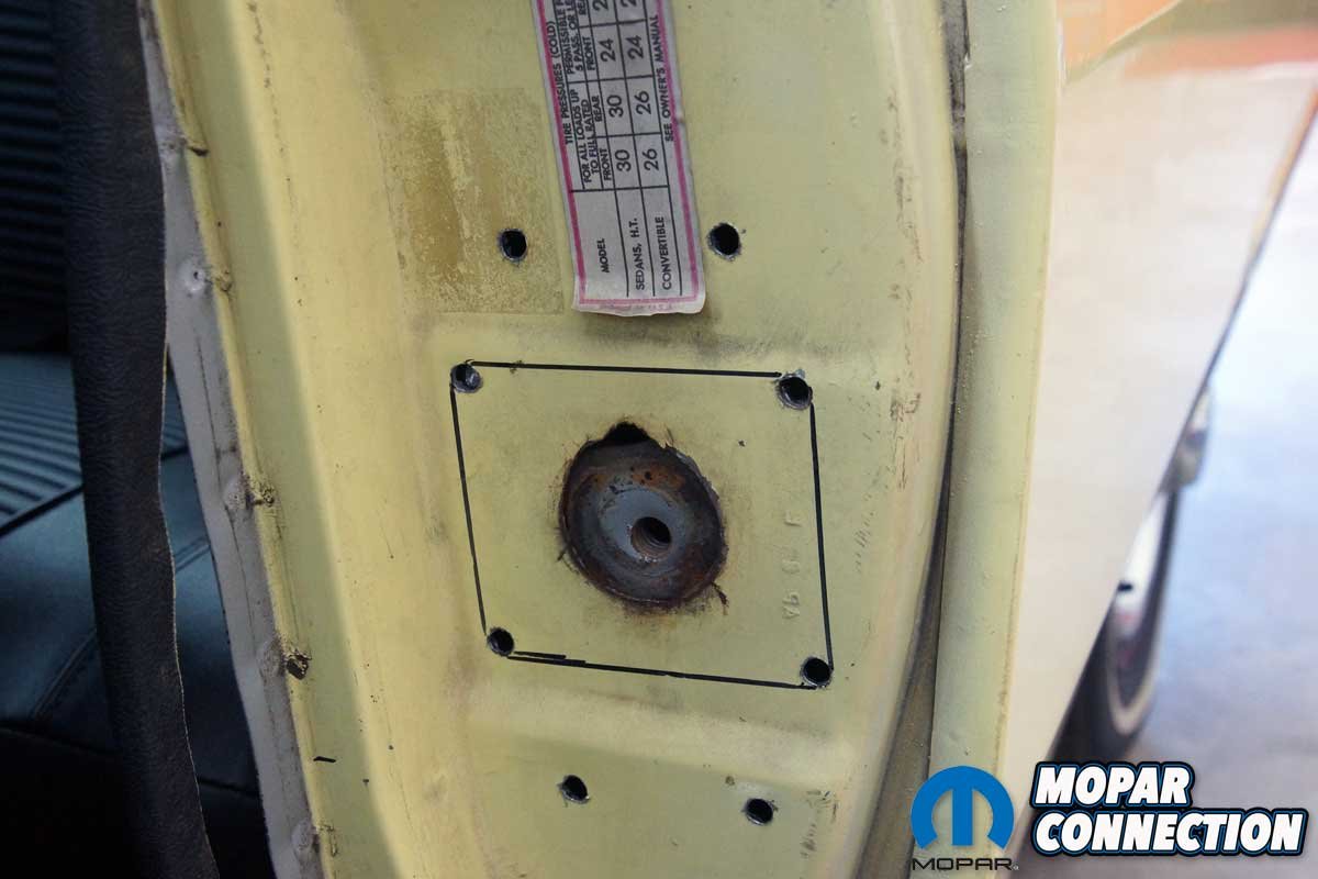 With the door jamb repair plate, Classic Industries supplied an instruction sheet and a paper template to properly locate the areas of the door jamb that would be drilled or removed. The first step of the repair was to detach the existing door post. Unfortunately, our Dart’s post was extremely tight (into its nut), and just about the moment we felt the Allen socket was going to break, the post threads snapped free. Once loose, the post was unthreaded without any additional difficulty.