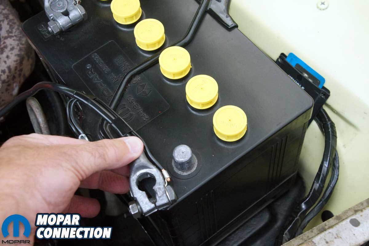 Above Left: Our ’67 Dart experienced the failure of the door jamb support. The factory steel is only 0.040-inch thick. Above Right: Because we would need the driver door open and we would be welding, we disconnected the battery, so the battery would not be drawn down due to the dome light operation, and the electrical system would not be exposed to damage from the welding process.