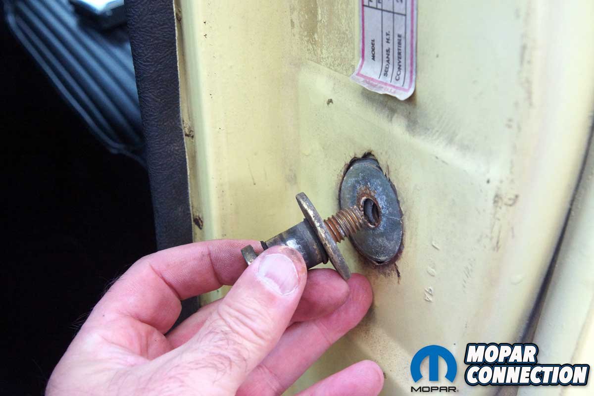 Above Left: The post wobbled around in the door jamb. However, the post’s threads were extremely tight in the caged nut on the other side of the sheet metal. Above Right: After the post broke free, we were able to remove the post and a washer. Unfortunately, the fractured sheet metal dropped into the inner panel. We fished it out later in the process.
