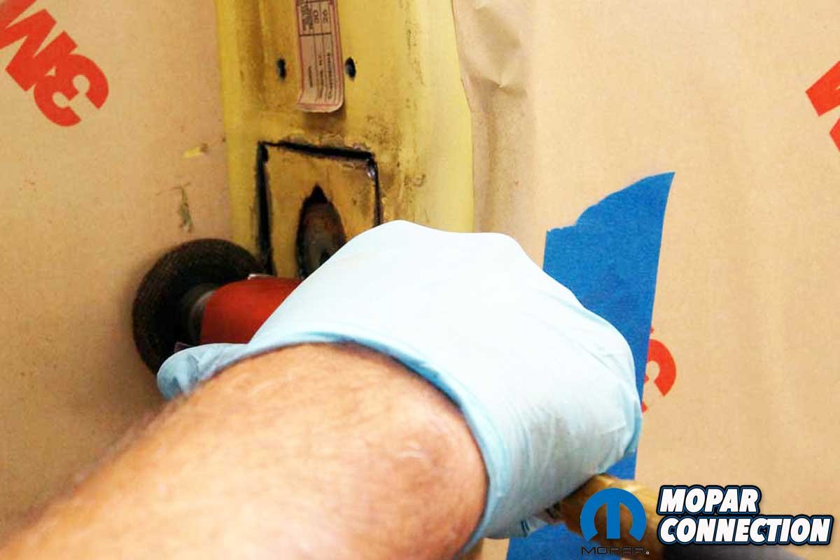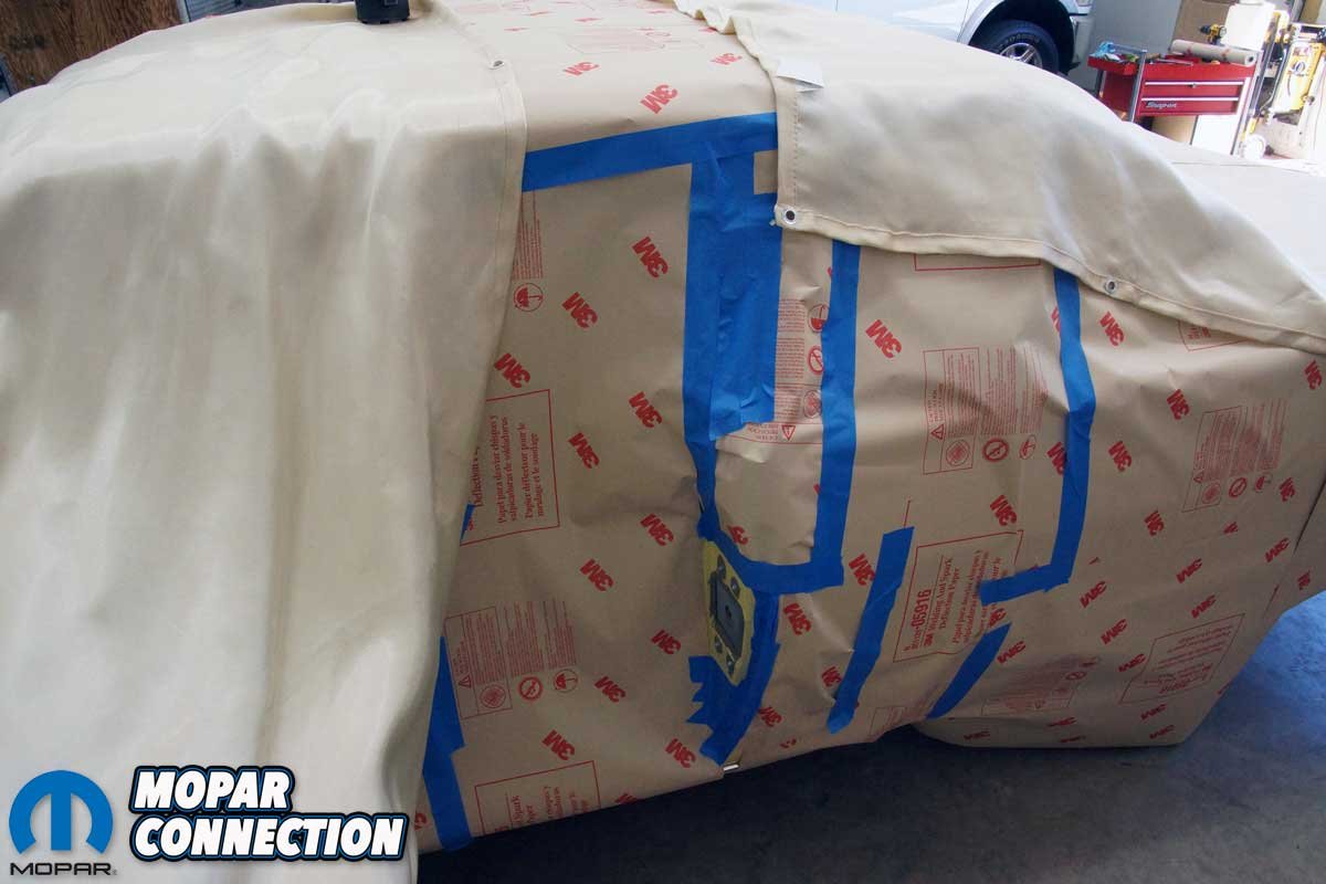 To protect the paint and interior from flying sparks from our cut-off wheel, we secured protective welding paper to the door opening and laid 8- X 8-foot welding blankets over the Dart. The cut-off wheel quickly cut through the thin factory sheet metal, and at each corner, we took our time not to cut past the drilled holes.