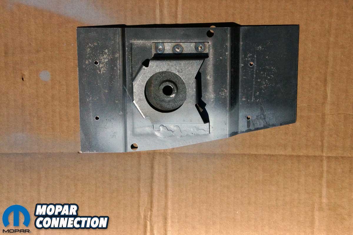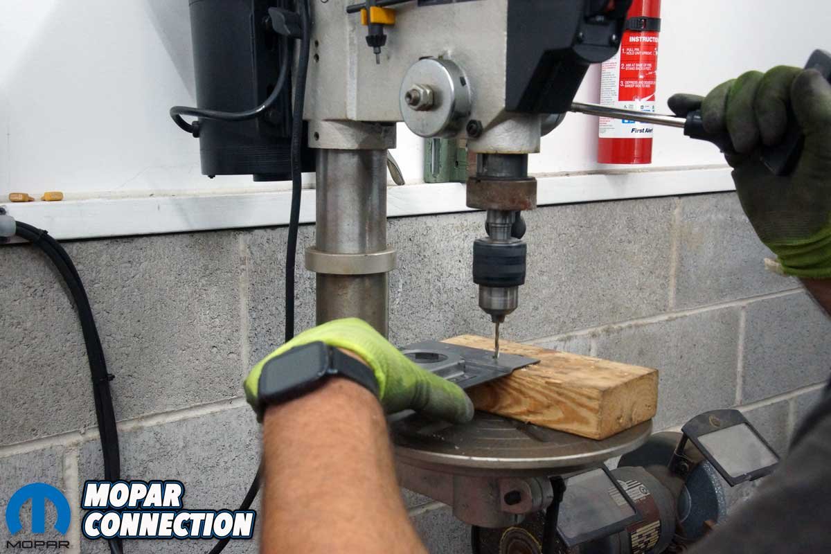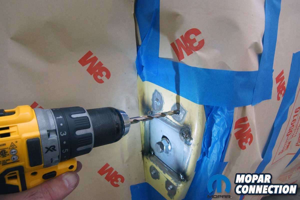 We removed the plate and center punched all four marks. The instruction sheet suggested using a #29 (0.136-inch) drill bit to make the holes, but we used a more common 5/64-inch (0.140-inch) bit. We utilized a drill press to make the holes. The repair plate had one edge of the nut cage welded to the plate, so after slipping the original nut into the cage and spraying the area with weld-through primer, we welded the other side of the cage to secure the nut.