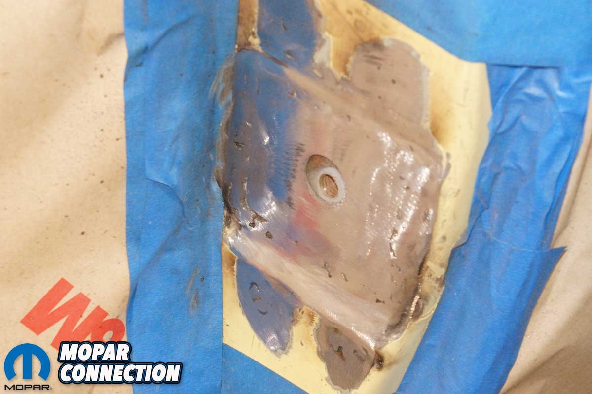 The instructions specified to tack weld each plate corner at the cutout opening, so we again installed the protective shielding and blankets on the Dart before welding. After spraying a small amount of weld-through primer onto the repair plate and door jamb, we tack welded the plate. With the welds in place, one sheet metal screw was removed, and the hole was chamfered with a 5/16-inch drill bit. We welded the hole closed and followed the same procedure for the remaining screws.