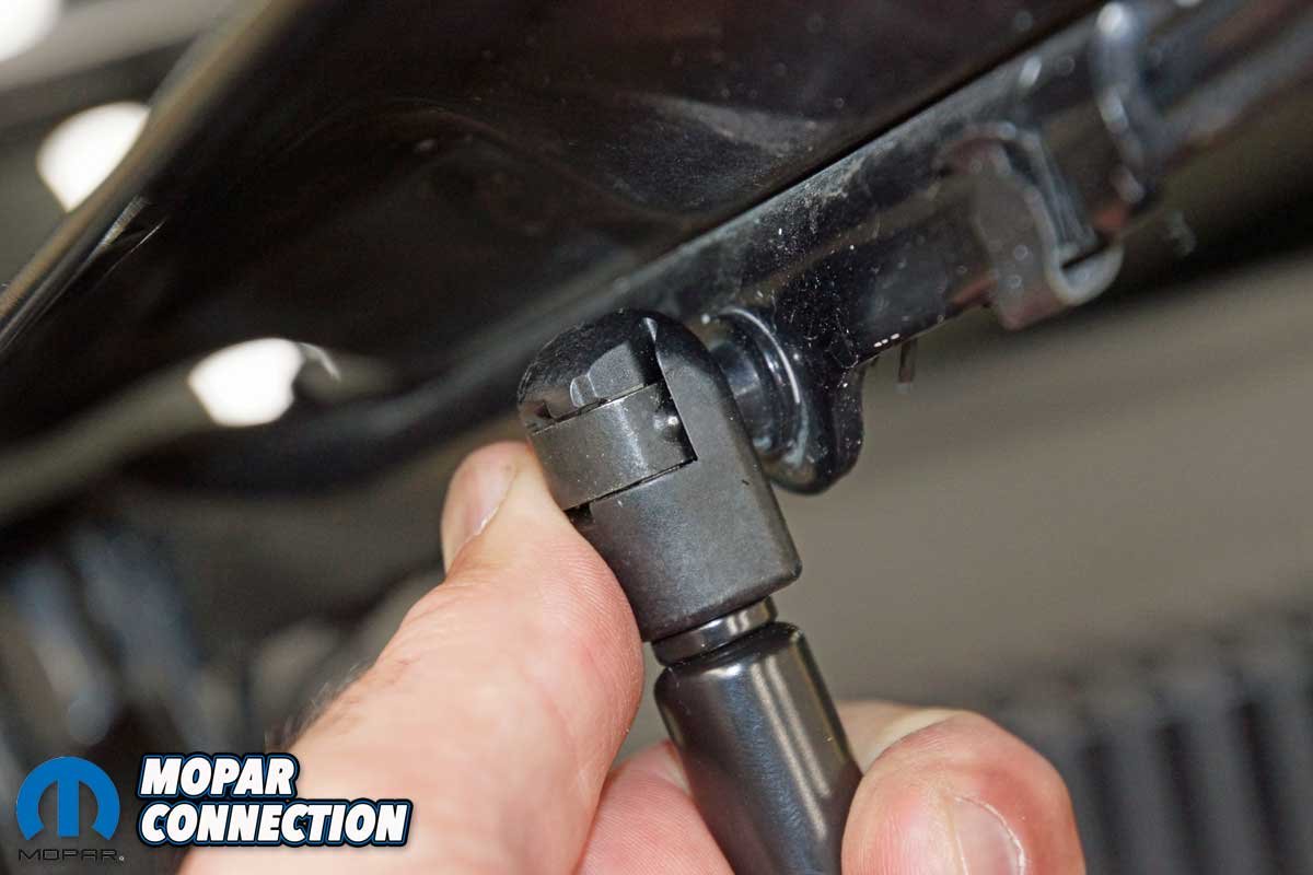The struts were labeled left and right. We selected the left support (driver side) and oriented it with the housing end toward the hood stud and the extending rod in the downward direction to the apron stud. To install the strut, we pressed each end over its corresponding stud. With a solid click on each end, the support was in place. We installed the right-side strut in the same fashion.