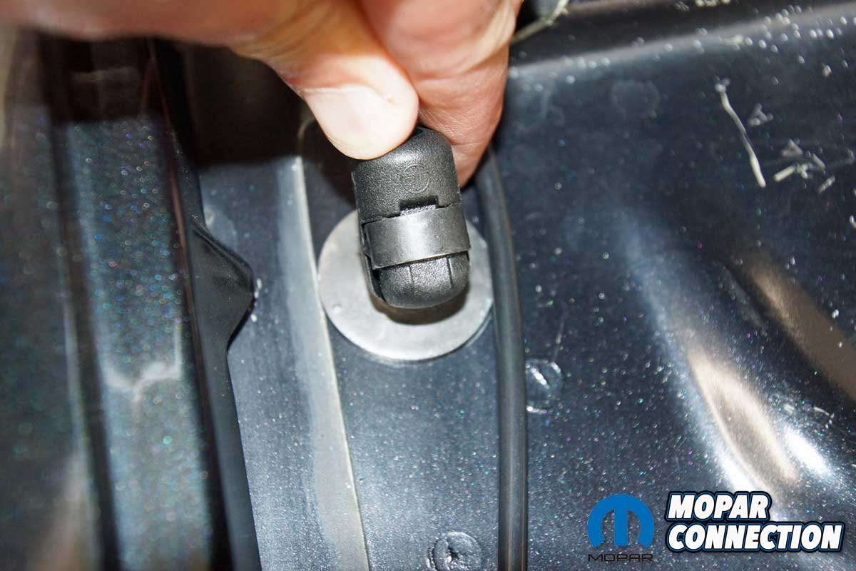 Top Left: Each bolt/stud was secured with a 13mm socket and ratchet. Top Center: The stud looked stock because it was a factory part. Top Right: The upper end of the strut housing was snapped onto the hood stud. Bottom Left: The lower end of the support was clipped onto the previously installed stud. Bottom Center: We repeated the same procedure on the other side of the hood. Bottom Right: Satisfied with the operation of the struts, we decided to remove the hood prop. We started with the removal of the hood prop clip.