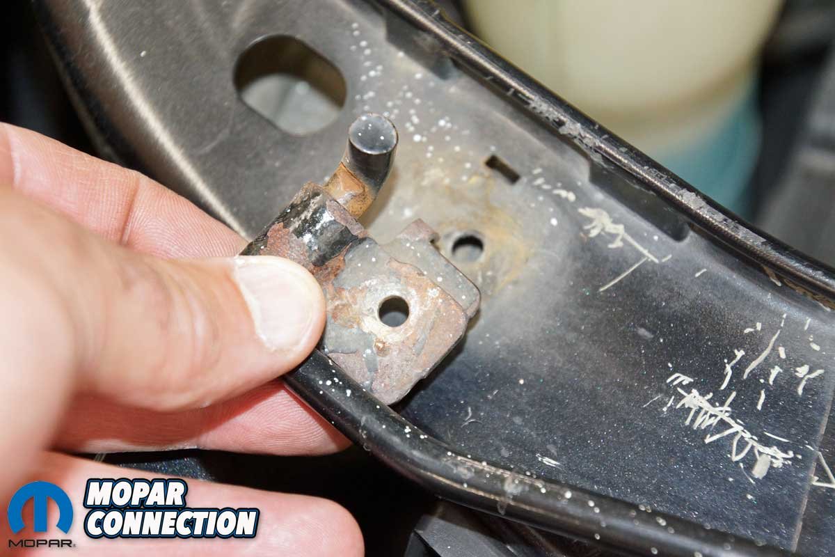 After testing the proper operation of the struts by closing and opening the hood, we elected to remove the factory hood prop by drilling through the rivet on the prop rod anchor. We also detached the hood prop clip from the radiator support.