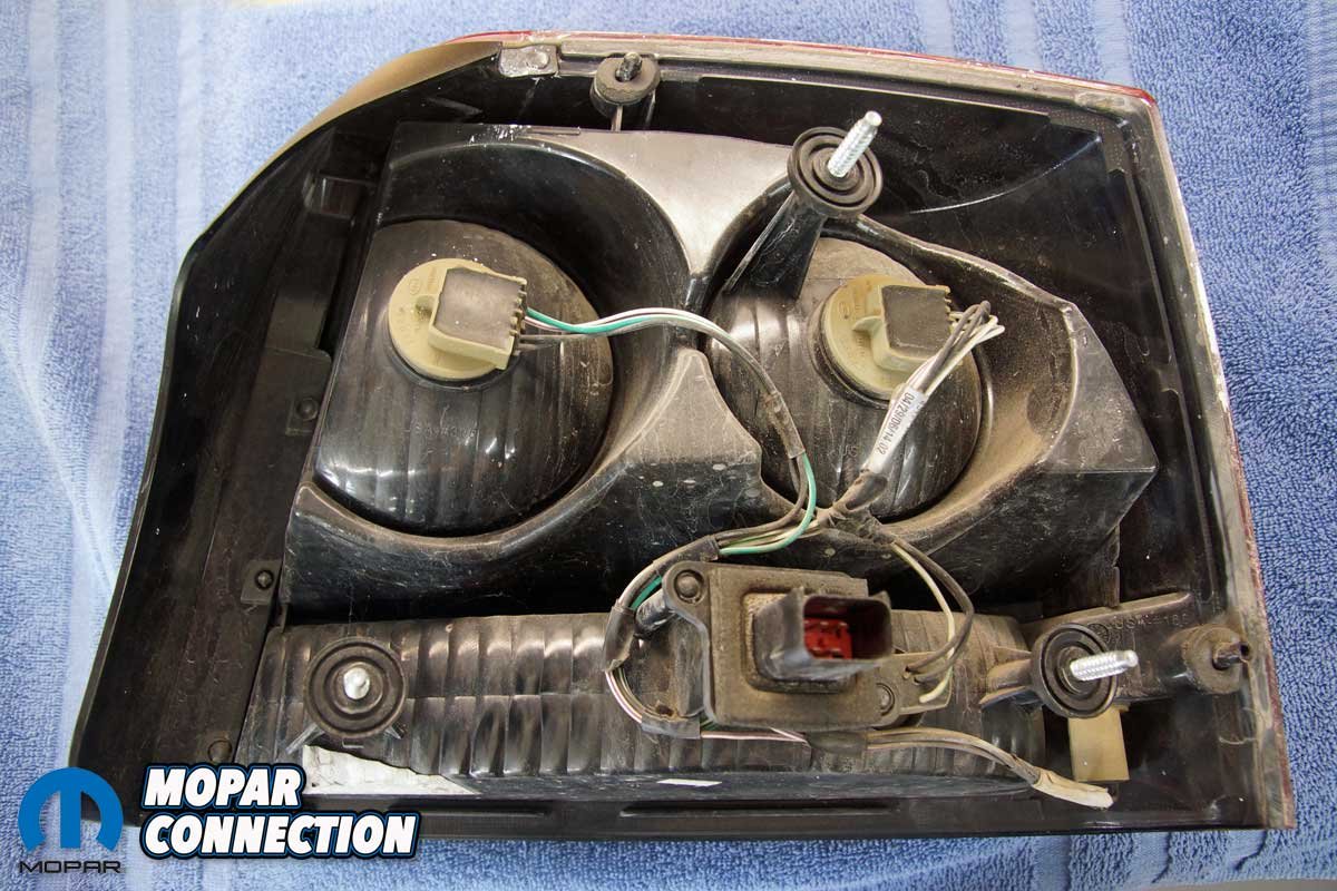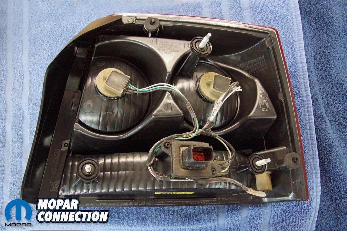 We removed the second and third wingnuts, and the taillight was removed from the Charger. With the housing out of the car, we took a moment to compare the new unit to the original. We were pleased to find the housing’s molded shape was identical to the factory, and the new taillight had the same style of reflective chrome, a deep, rich red lens, and a clear reverse light lens. The taillight harness had to be transferred from the original housing to the new unit.