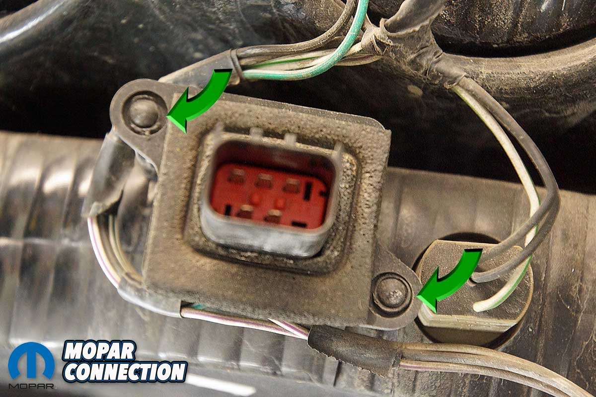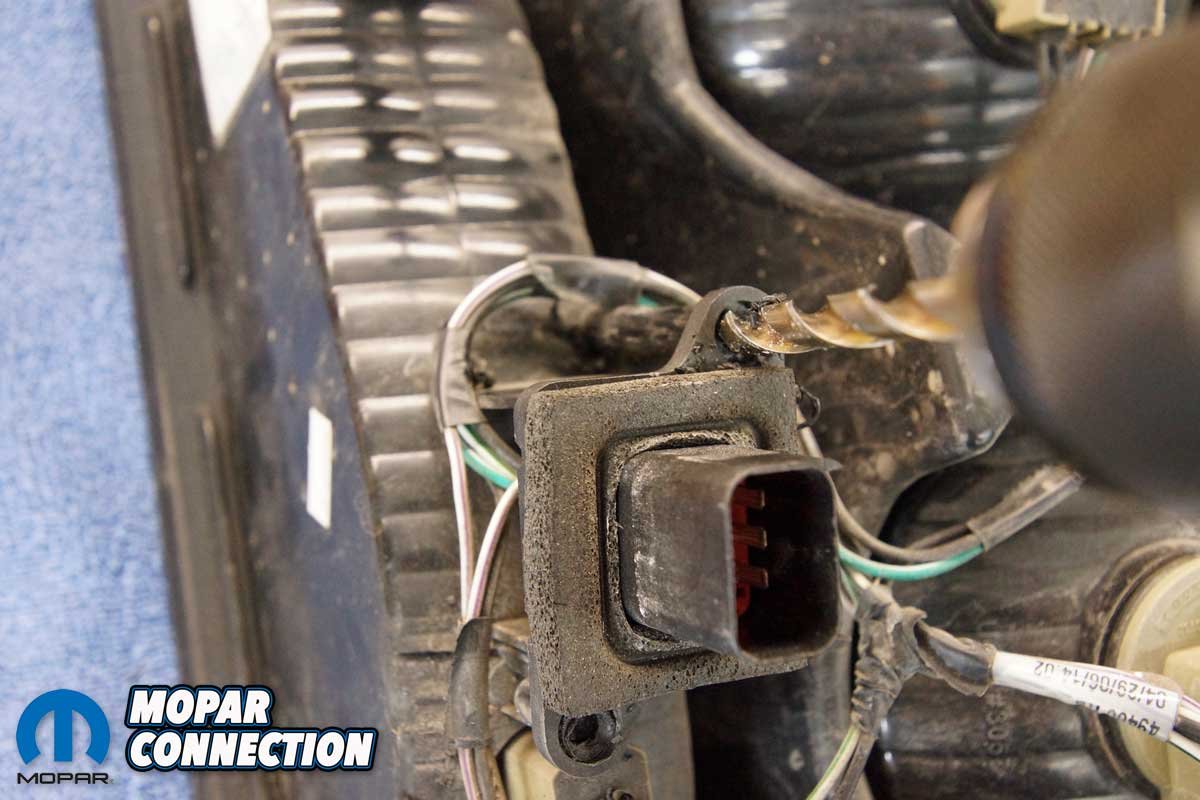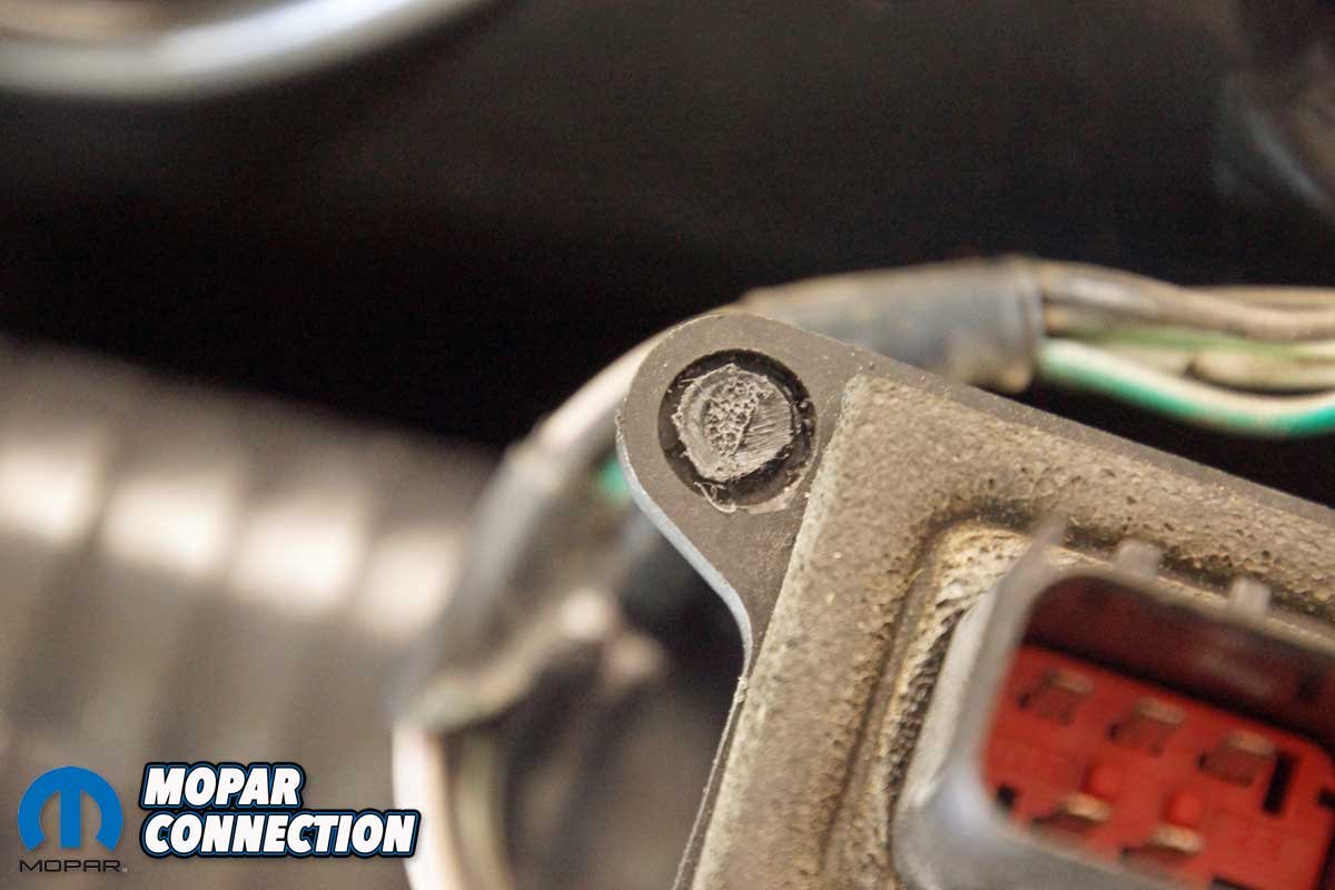 We had to drill away enough of the two plastic studs to free the connector from the housing. Once the harness was transferred, we guided the connector over the studs on the new housing. To secure the connector to the housing in a manner similar to the factory, we heated a bolt and melted the top of each plastic stud. The melted studs secured the connector.