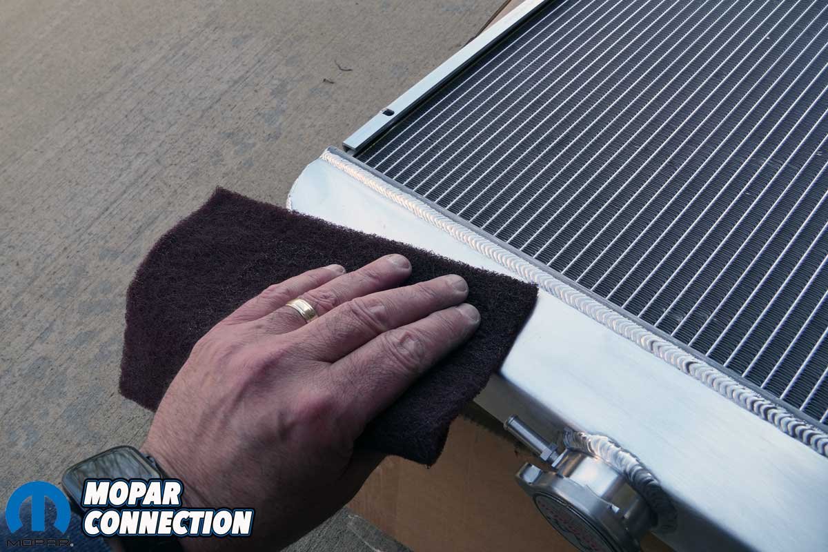 When the Champion radiator arrived, it was readily apparent that the factory shroud would again not fit onto its shroud support. Nonetheless, we went forward with our short-term plan to use the radiator. To diminish the appearance of the aluminum radiator, we scrubbed it with a Scotch Brite Pad, cleaned its surface, and painted it with high-temperature black paint.