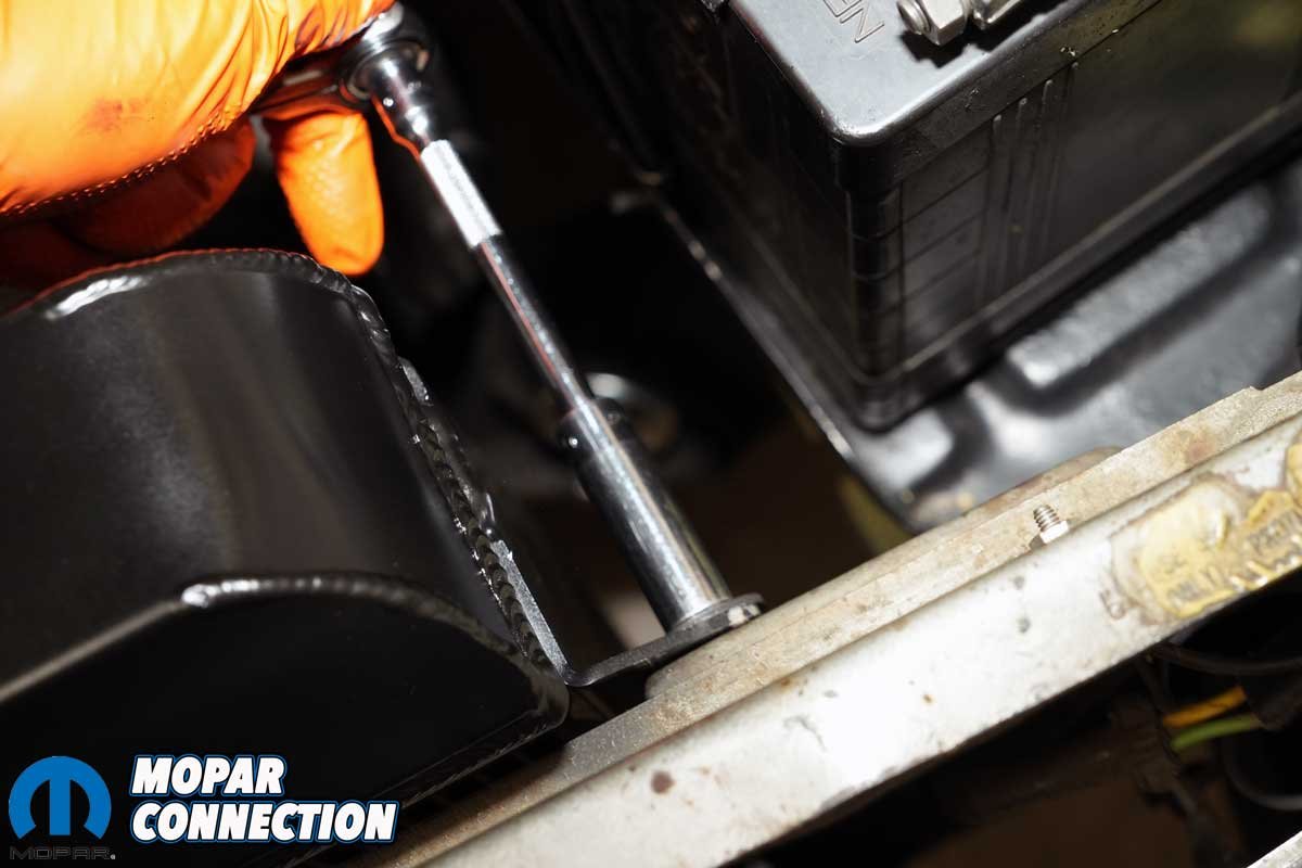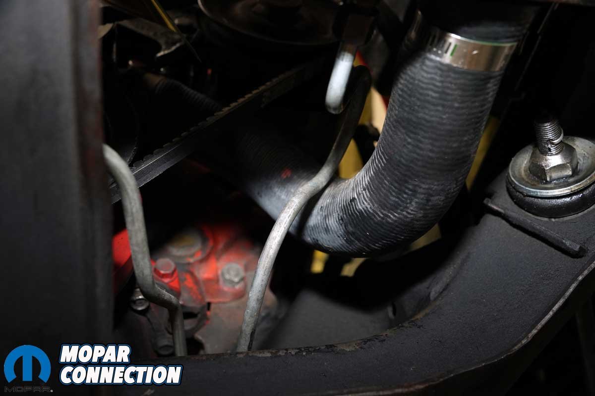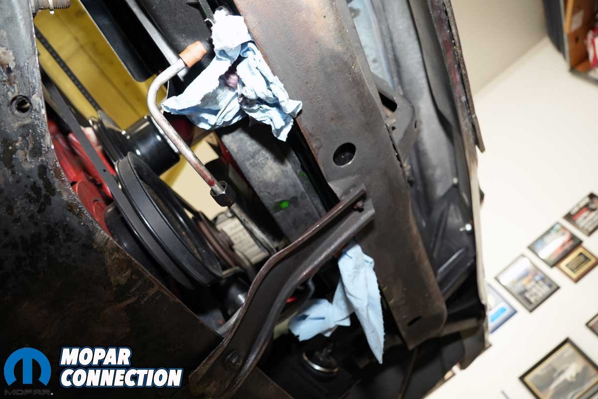 After letting the Champion radiator sit for about a week, we finally got time to pull the leaky radiator. Because we had removed the radiator so many times in the last year, it was out of the Dart’s chassis in no time. With the radiator cleared, we had access to areas where the coolant from the leaking radiator had been pooling. We spent a few minutes cleaning the radiator support and the K-member.
