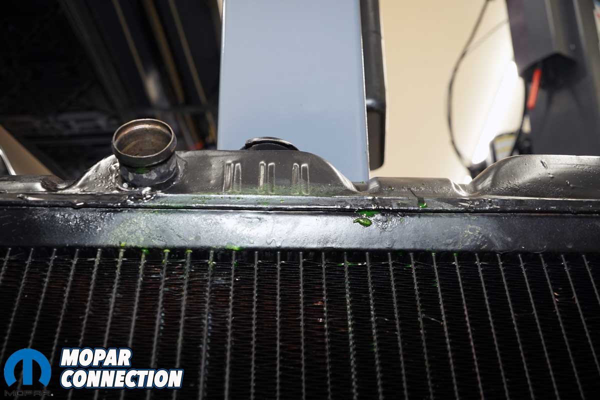 Above: With the radiator out of the Dart, we noted discoloration on the seam of the top tank. The coolant staining and even leakage could be seen. A business attempted to fix the problem multiple times but failed to succeed.