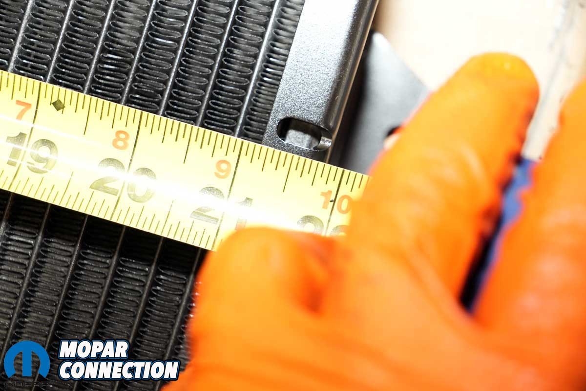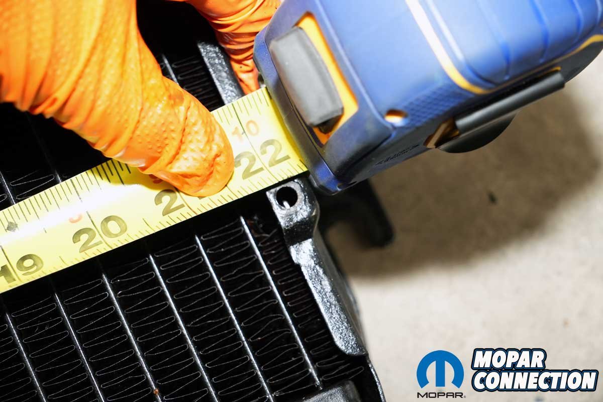 Above Left: The factory radiator shroud’s mounting flanges were 22 inches on center, and the flanges had raised areas to match the shroud’s contours. Above Right: The Champion radiator (and all three other aftermarket radiators we tested) measured at 21 1/2 inches center-to-center at the mounting flanges. Also, the flanges were void of the raised areas to match the shroud’s contours. We continued with the radiator installation but would not be reinstalling the shroud.