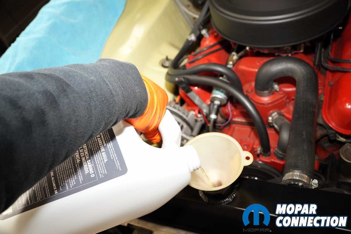 The factory did not have overflow tanks in 1967, but we added an overflow several years ago (Keep Your Cool(ant) with a Mancini Racing Recovery Tank). We routed the radiator overflow tube to our recovery tank. With everything buttoned up, we added ethylene glycol (coolant) to the radiator and the overflow tank.