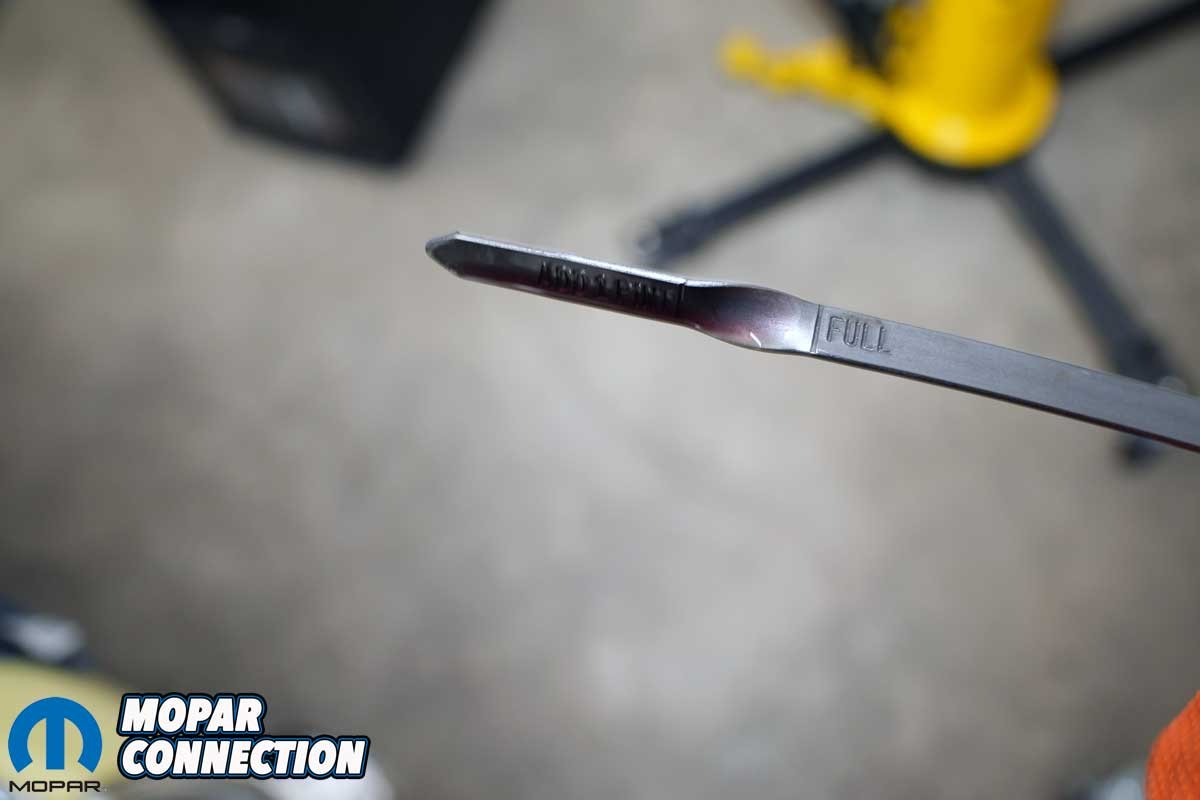 Above Left: Because we removed the original transmission cooler (located in the factory radiator), we checked and then added a small volume of transmission fluid to reestablish the correct level. Above Right: For a moment, we thought our new radiator was leaking at the weld of the filler neck. It turned out, the overflow nipple had not been tightened during assembly, so we snugged it down, and the leak stopped.