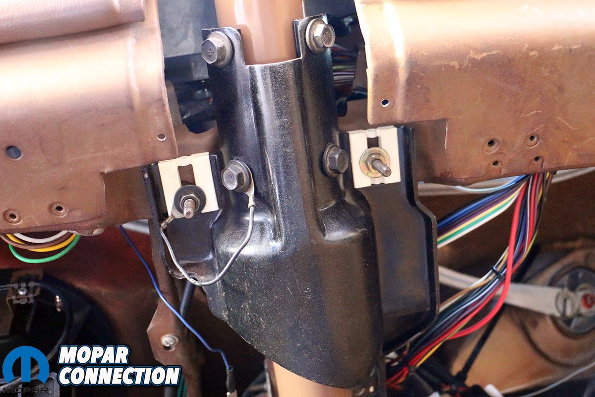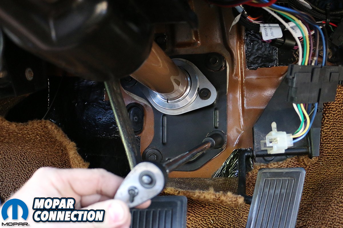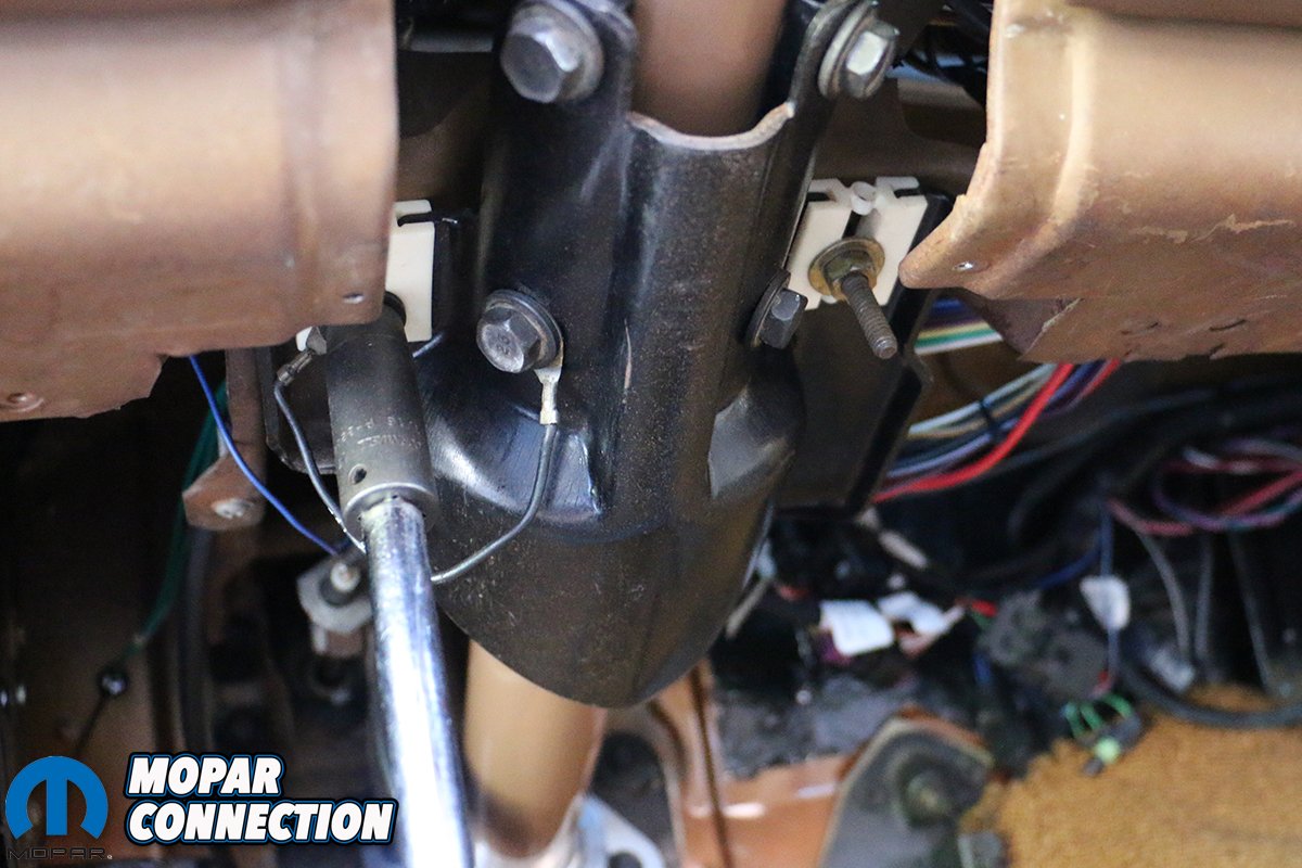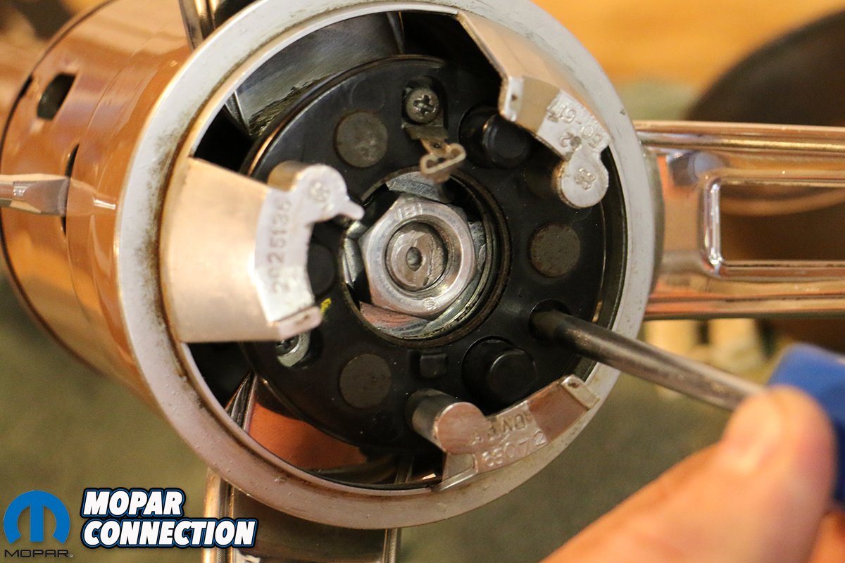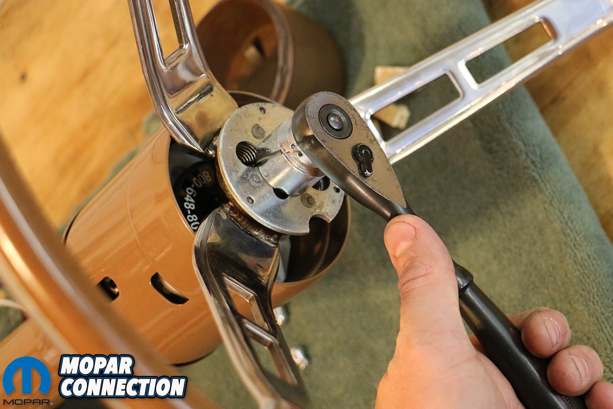 The shroud is merely pressed on, and replacing the shorter shroud with the longer one took only some minor coaxing to pop off and tap on the new piece – all without galling our powder coat finish. Also note that Mopar wheels – unlike GM or aftermarket wheels – have keyways cut into the grooves, so make sure to let them know this prior to ordering. Also note that the horn relay cam is a GM piece and has a stem where the horn button wire protrudes from. This needs to be fed through the threaded puller holes in the base of your wheel, so you’ll be using a pulley puller to remove your steering wheel from here on out. Mounting brackets accept the factory ignition switch bracket, and sliding on the billet collar that mounts the base of the column to the factory steering column support bracket is a breeze.