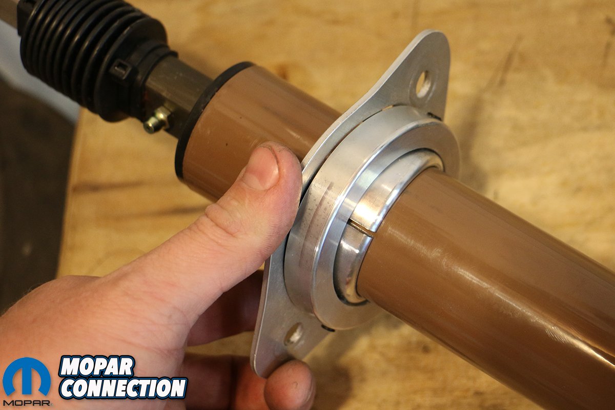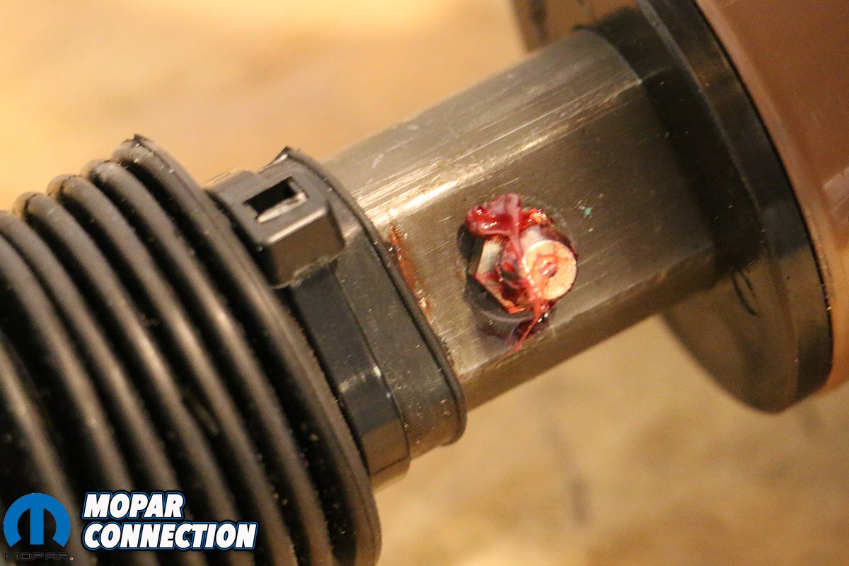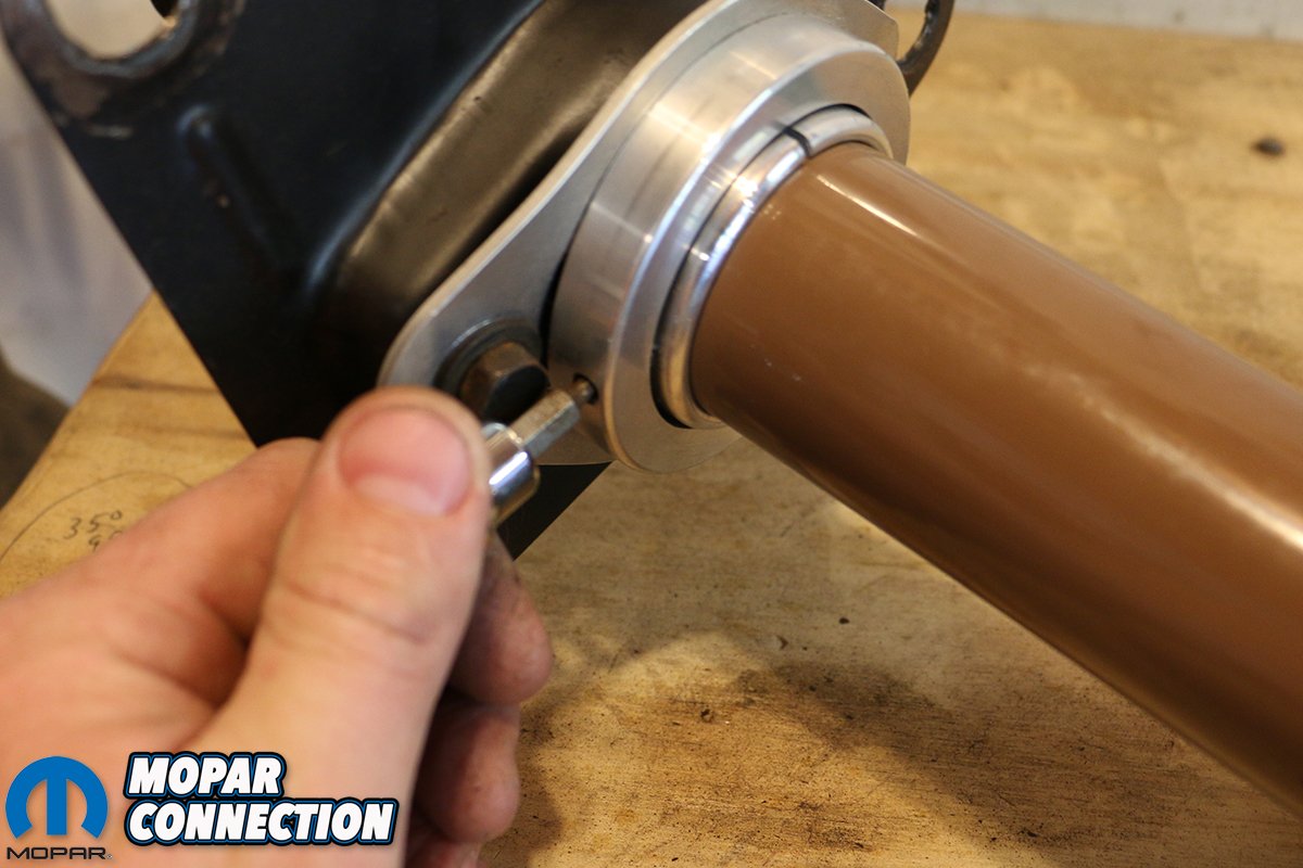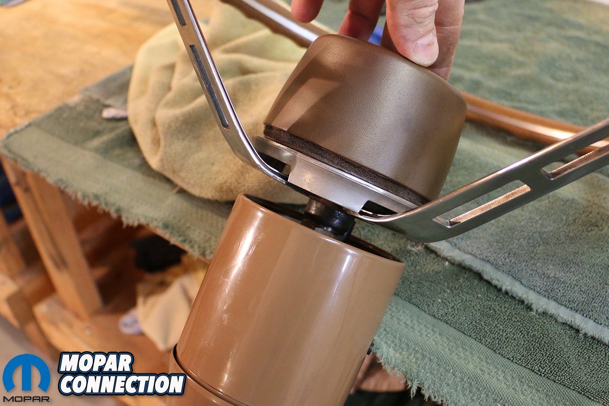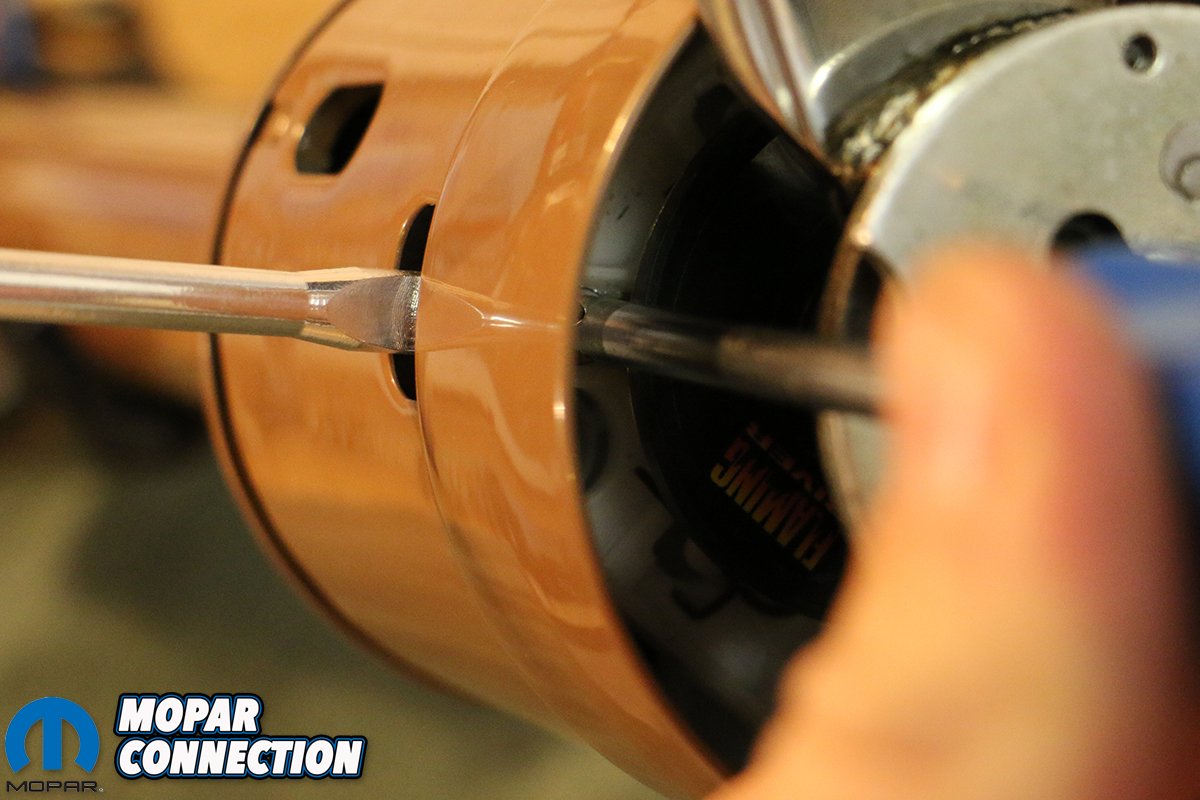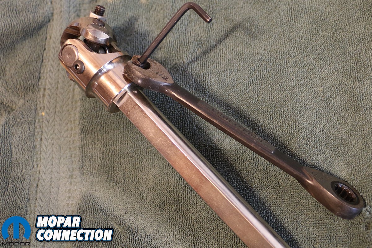 The shroud is merely pressed on, and replacing the shorter shroud with the longer one took only some minor coaxing to pop off and tap on the new piece – all without galling our powder coat finish. Also note that Mopar wheels – unlike GM or aftermarket wheels – have keyways cut into the grooves, so make sure to let them know this prior to ordering. Also note that the horn relay cam is a GM piece and has a stem where the horn button wire protrudes from. This needs to be fed through the threaded puller holes in the base of your wheel, so you’ll be using a pulley puller to remove your steering wheel from here on out. Mounting brackets accept the factory ignition switch bracket, and sliding on the billet collar that mounts the base of the column to the factory steering column support bracket is a breeze.