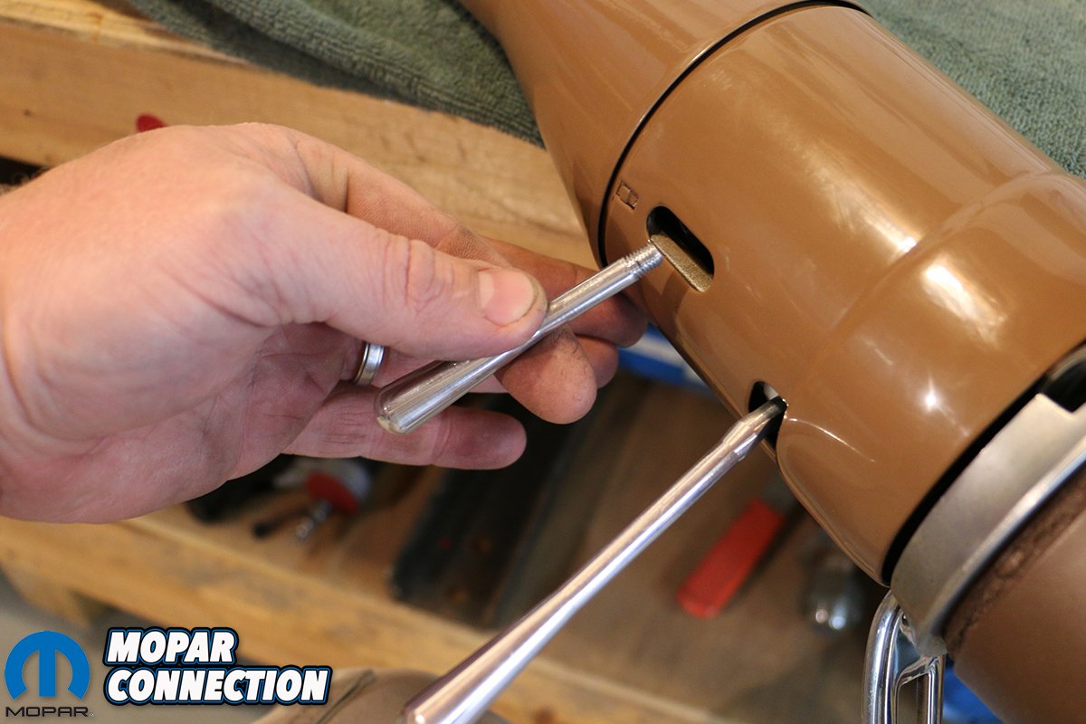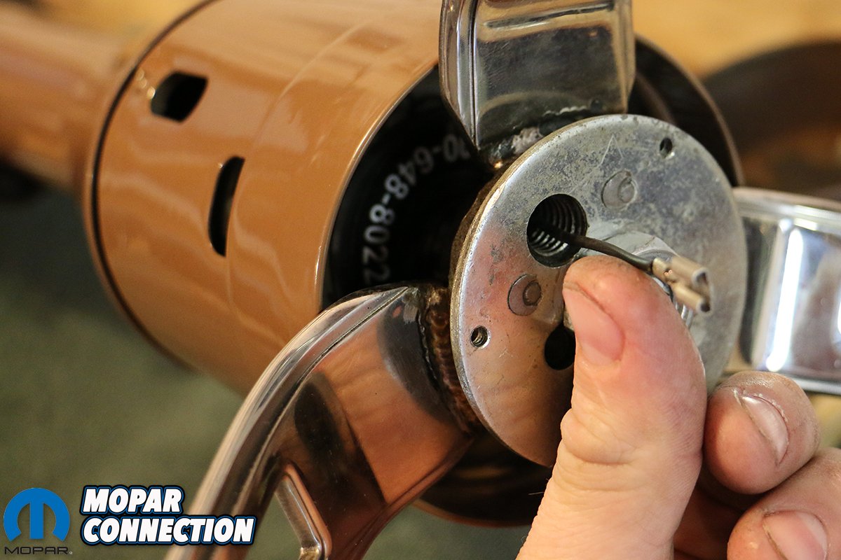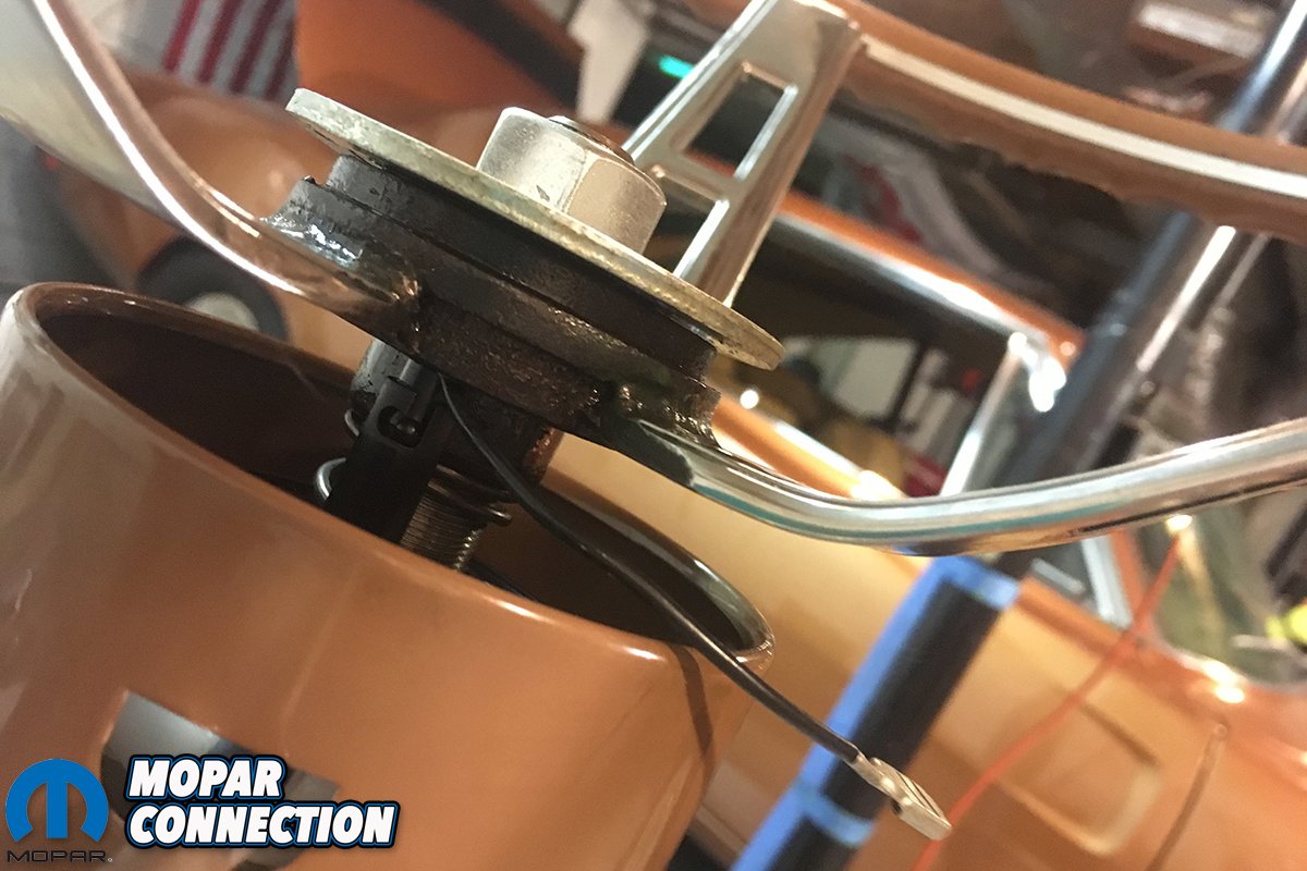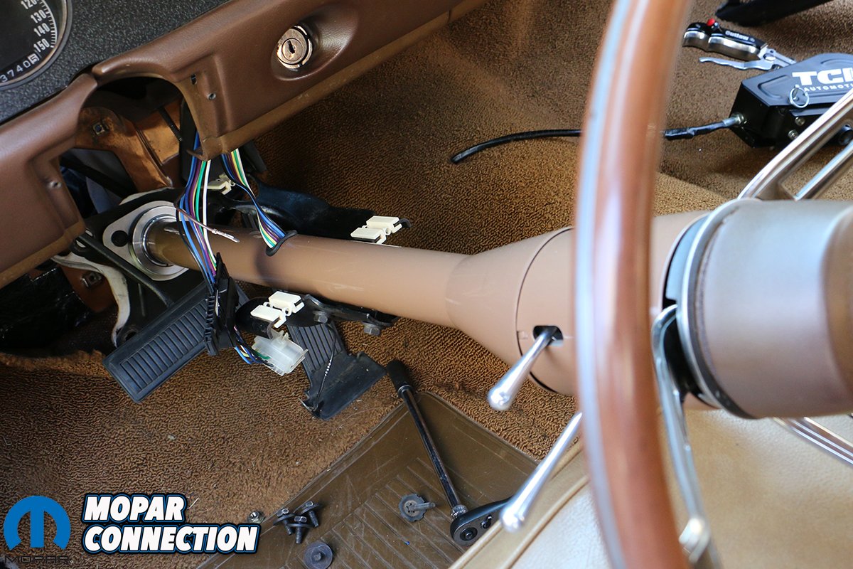 Upon arrival we realized that we had made one key error in ordering: we failed to alert Flaming River to the type of steering wheel we were using (besides saying it was a “factory wheel”). Most will know that Chargers came with three different kinds of steering wheels, and discovered that the three fit very differently from one to another. While a very basic black plastic wheel might have 3/8-inch of a gap from the base of the wheel to the column’s shroud, the R/T wheel has a deeper collar, and at least on the Flaming River column, didn’t have deep enough threads to allow us to suck up the gap. “Dude, we have a different shroud that’s about 1/2-inch longer,” Jennings teased. “I’ll send that right over.” So again, Flaming River to the rescue.
