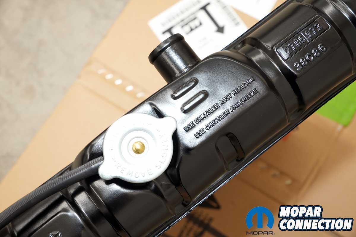Above Left: The Glen-ray radiator is an excellent example of how a factory radiator should appear. Above Center: The top tank came with all the correct stampings. We selected part number 2785973, a perfect match for our ’67 Dart. Above Right: The radiator included an overflow rubber hose to route expelled coolant.