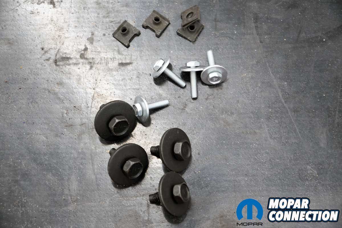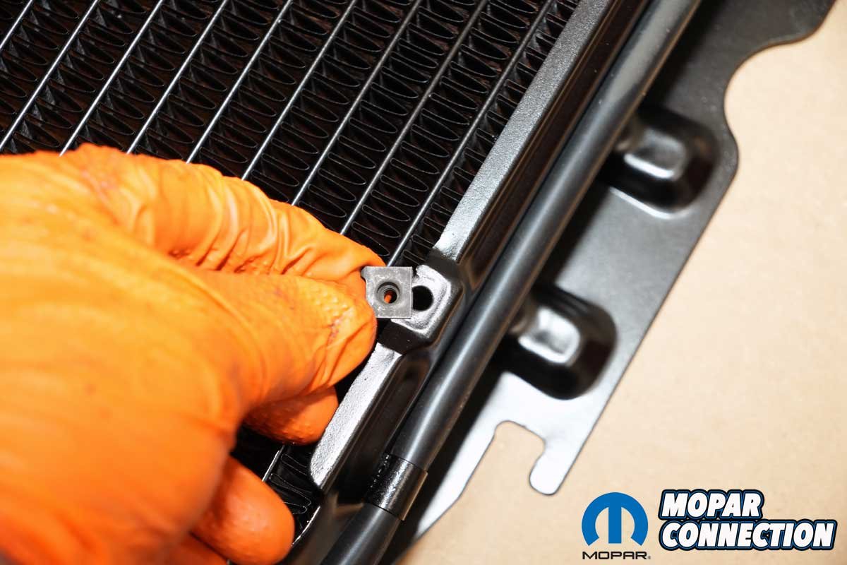 Above Left: We loosely threaded in the two lower new radiator mounting bolts, which matched the original bolts. Above Right: We installed the shroud mounting clips onto the tabs of the radiator brackets. With a little push, the clips slipped onto the radiator.