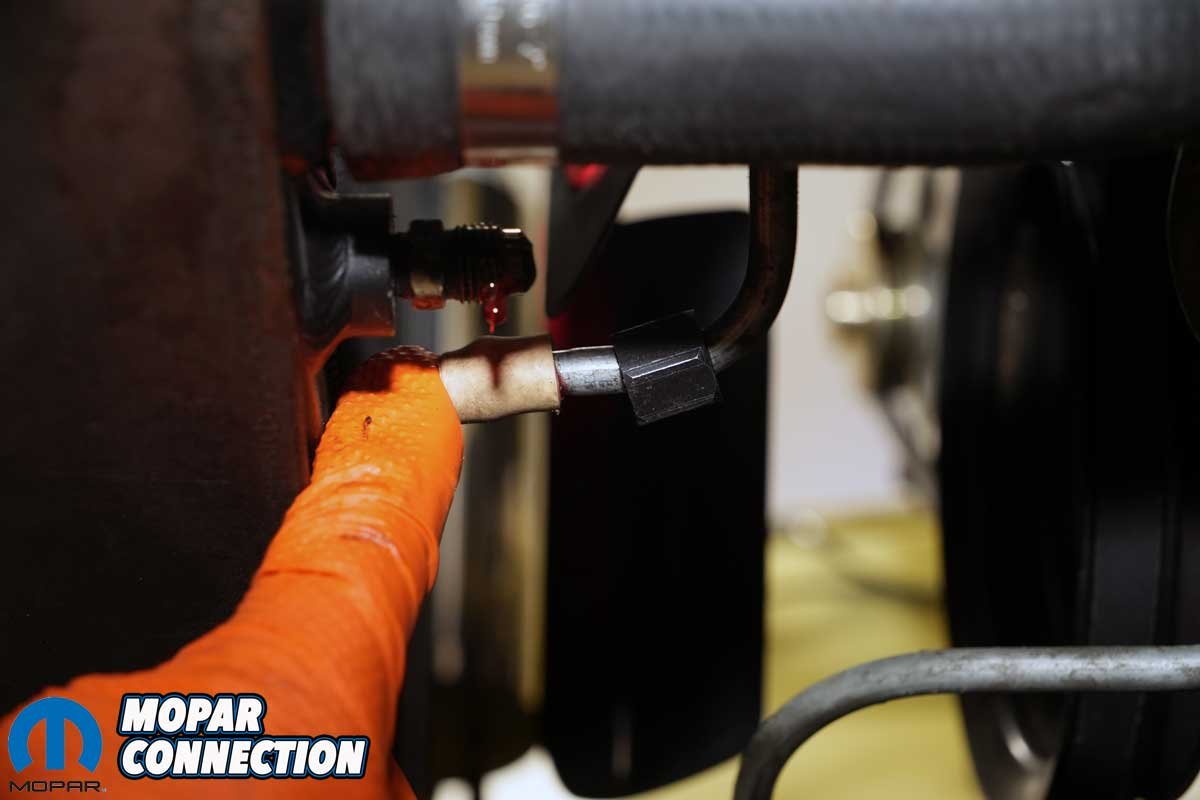 Above Left: We needed to drain the coolant to remove the Champion radiator. Above Right: The two transmission lines also needed to be disconnected. We capped the lines to prevent a loss of transmission fluid.