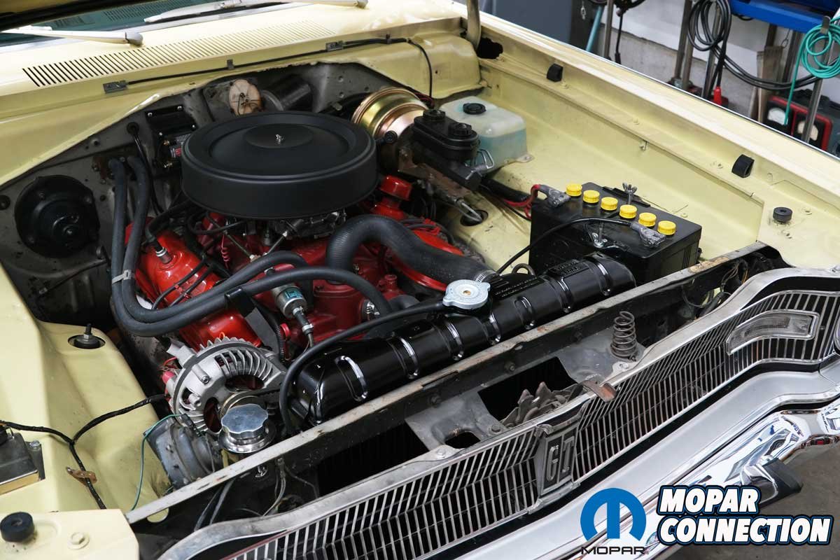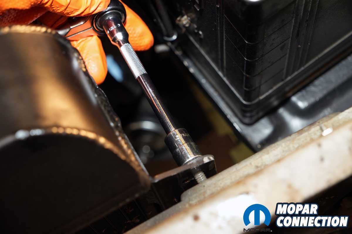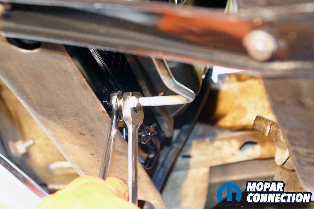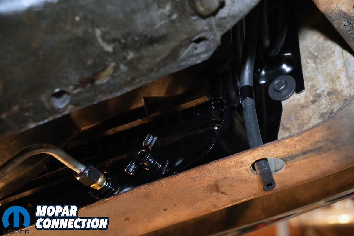 After removing the two lower radiator mounting bolts, we installed two of the four new bolts supplied with the new radiator. With the bolts loosely installed, we hoisted the Glen-ray radiator over the Dart’s radiator support and slipped it over the two mounting bolts. We secured the top of the radiator to the radiator support with the other two new mounting bolts.