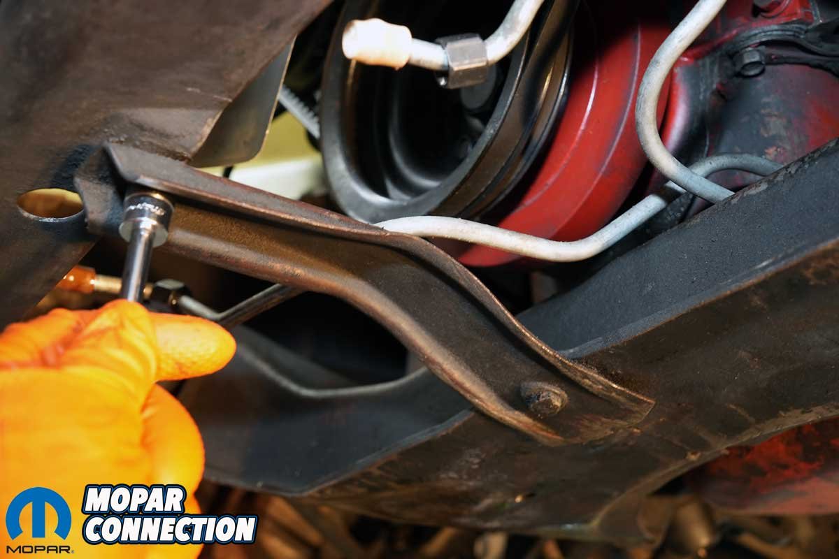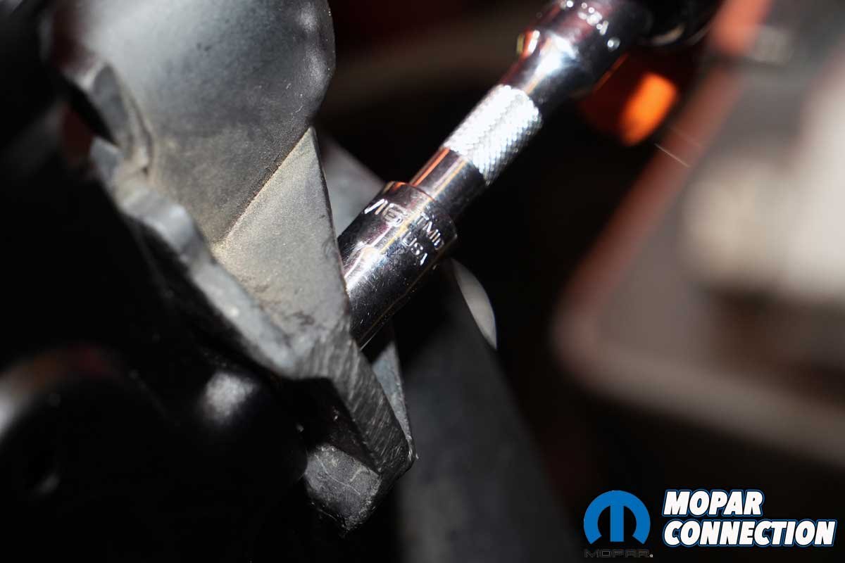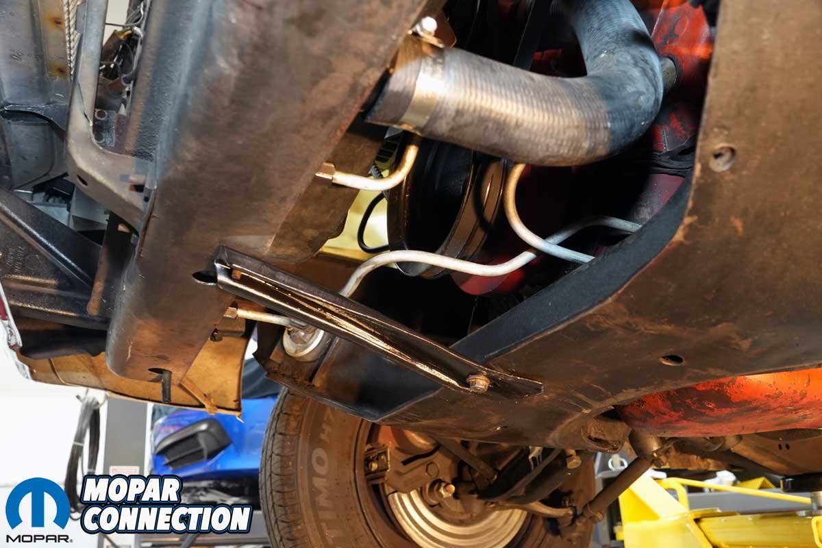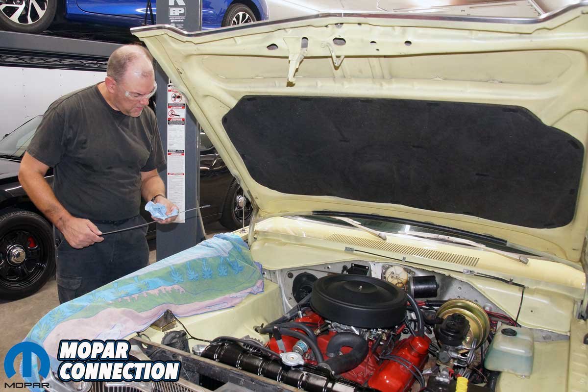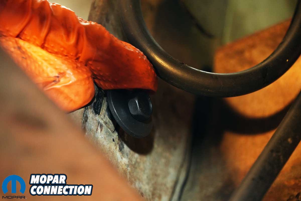After removing the two lower radiator mounting bolts, we installed two of the four new bolts supplied with the new radiator. With the bolts loosely installed, we hoisted the Glen-ray radiator over the Dart’s radiator support and slipped it over the two mounting bolts. We secured the top of the radiator to the radiator support with the other two new mounting bolts.
