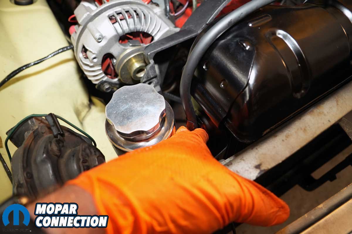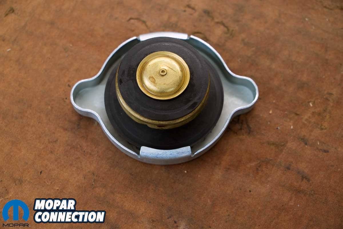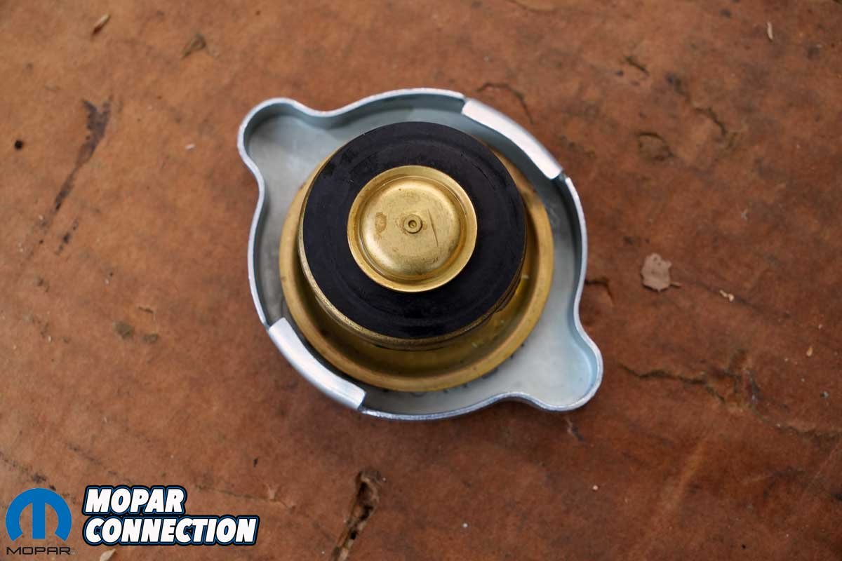 The radiator cap with the new radiator was designed to work with an open system, which was correct for a 1967 vehicle. We needed to add a rubber seal to the cap to convert it to operate with a closed system. The new seal ensured a leak-free connection between the cap and the radiator’s filler neck. We modified the cap by adding a seal we retrieved from a used cap. All that was necessary to install it was to slip it over the smaller seal and spring of the radiator cap.