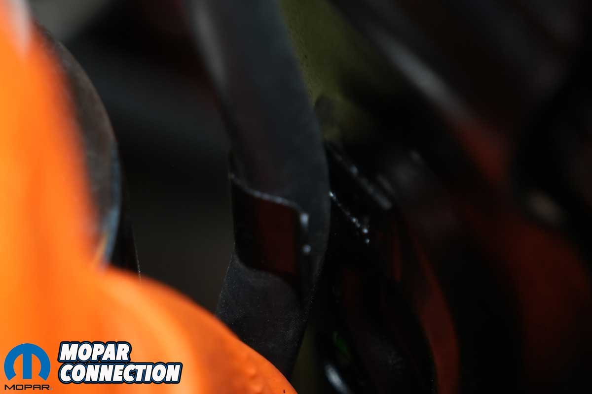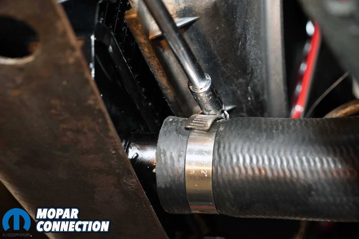 Above Left: The radiator came with two overflow hose retention clips. Instead of using the hose supplied with the new radiator, we used the hose previously installed with the Mancini Racing overflow tank. Above Right: The upper clip retained the hose so it would not move freely, keeping it from the fan and belts.
