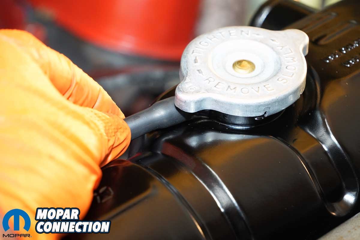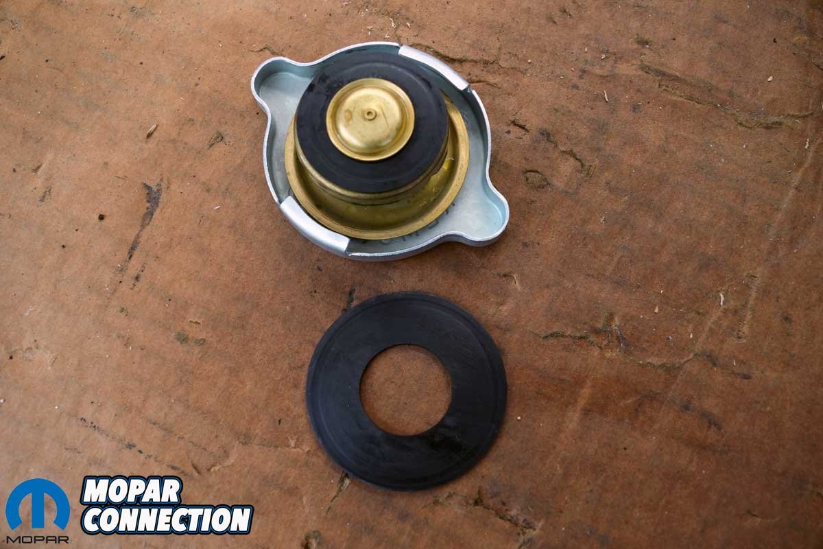 Above Left: We installed the seal over the center seal and spring. Above Right: The system was now sealed between the cap and the filler neck. With the seal installed, we added additional coolant to the overflow container.