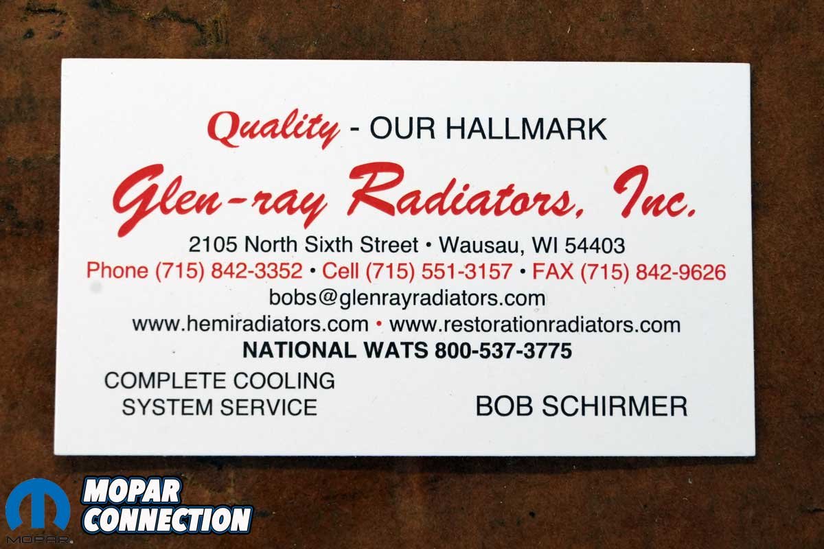 The day we picked up our Glen-ray radiator, Schirmer stated, “The radiator is guaranteed for life, apart from impacts with deer, trees, and idiots.” If you need a muscle car-era radiator for your Mopar, give the reps at Glen-ray a call. The knowledgeable team will guide you to the best cooling products for your car, and the quality of their radiators will allow you to keep your cool for many years to come.