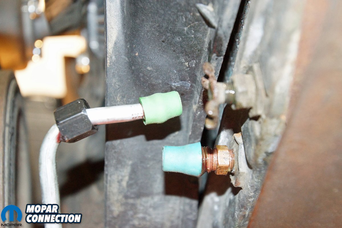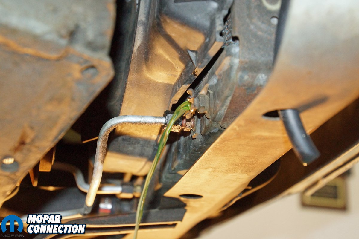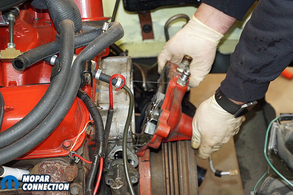 Above Left: Our test vehicle is a 1967 Dodge Dart with a small block, sporting 273 cubes. The engine was rebuilt before we purchased the Dart in September 2018, so we do not know what was done to the internals. We do know, the timing mark on the harmonic balancer bounces all over when we attempt to set the base timing at idle, and reading the total timing is even more difficult at 2800 rpm. Above Center: The first step required to install the Cloyes tensioner was to remove the engine coolant. We were lucky enough to have a petcock that opened freely. With the removal of the radiator cap, the coolant flowed more smoothly out of the radiator. Above Right: The transmission lines were removed from the radiator transmission cooler. To reduce the transmission fluid loss and to keep the work area clean, we capped the lines and the AN radiator fittings.