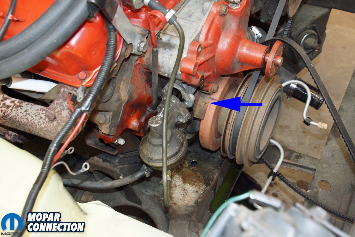 Above Left: The fan, clutch, and water pump pulley were removed, cleaned, and set aside for the reassembly of the engine. Because we are using 50-plus-year-old parts, if we had noticed any damage, those parts would have been replaced. Above Right: We loosened the fuel pump bolts. The fuel pump was pulled out of the front cover and set aside. Because our 273 was a pre-1970, it had a metal timing indicator tab (blue arrow) on the passenger side of the engine. The two lower water pump bolts retained the indicator tab.