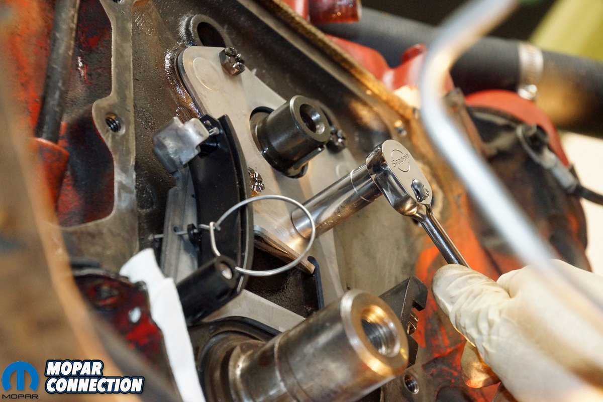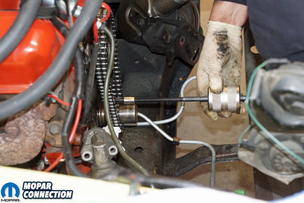Above: To reduce the timing chain slop we were currently experiencing, we contacted Hughes Engines and picked up a Cloyes tensioner (part no. CLO 9-5287) for our small block. The tensioner was initially designed for the LA and Magnum V6 engines, which suffered from noisy timing chains. With the advent of the tensioner, many Mopar small-block engine rebuilders began using them on their freshly rebuilt engines to minimize timing chain looseness.