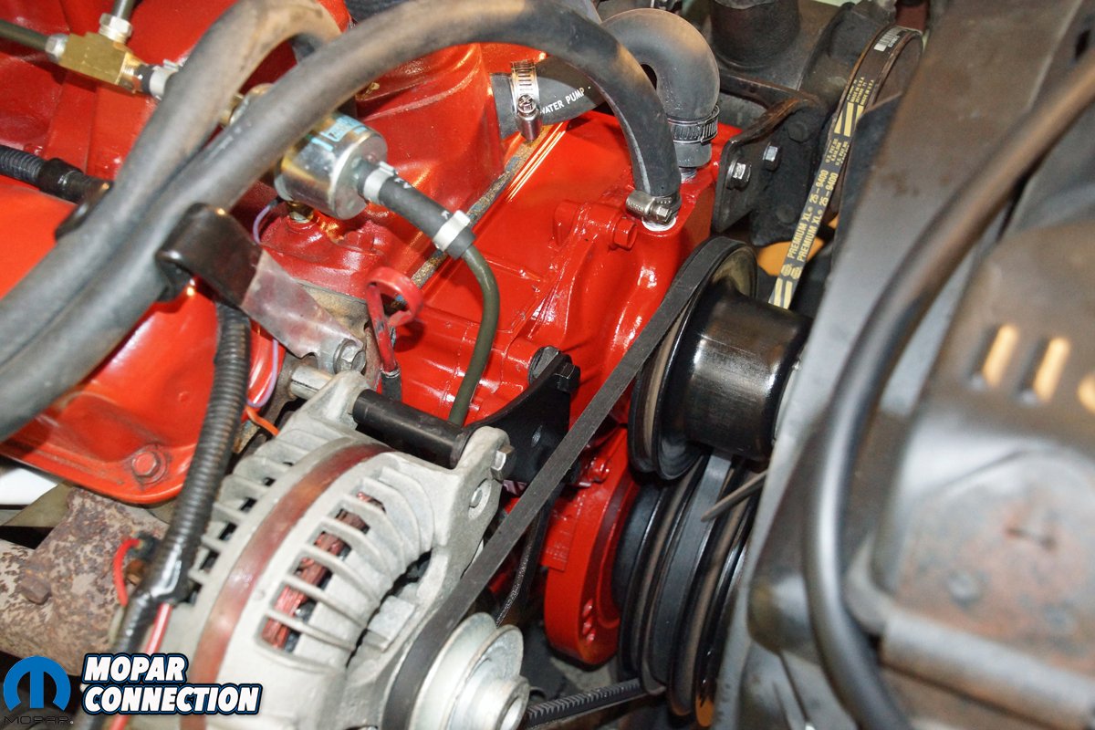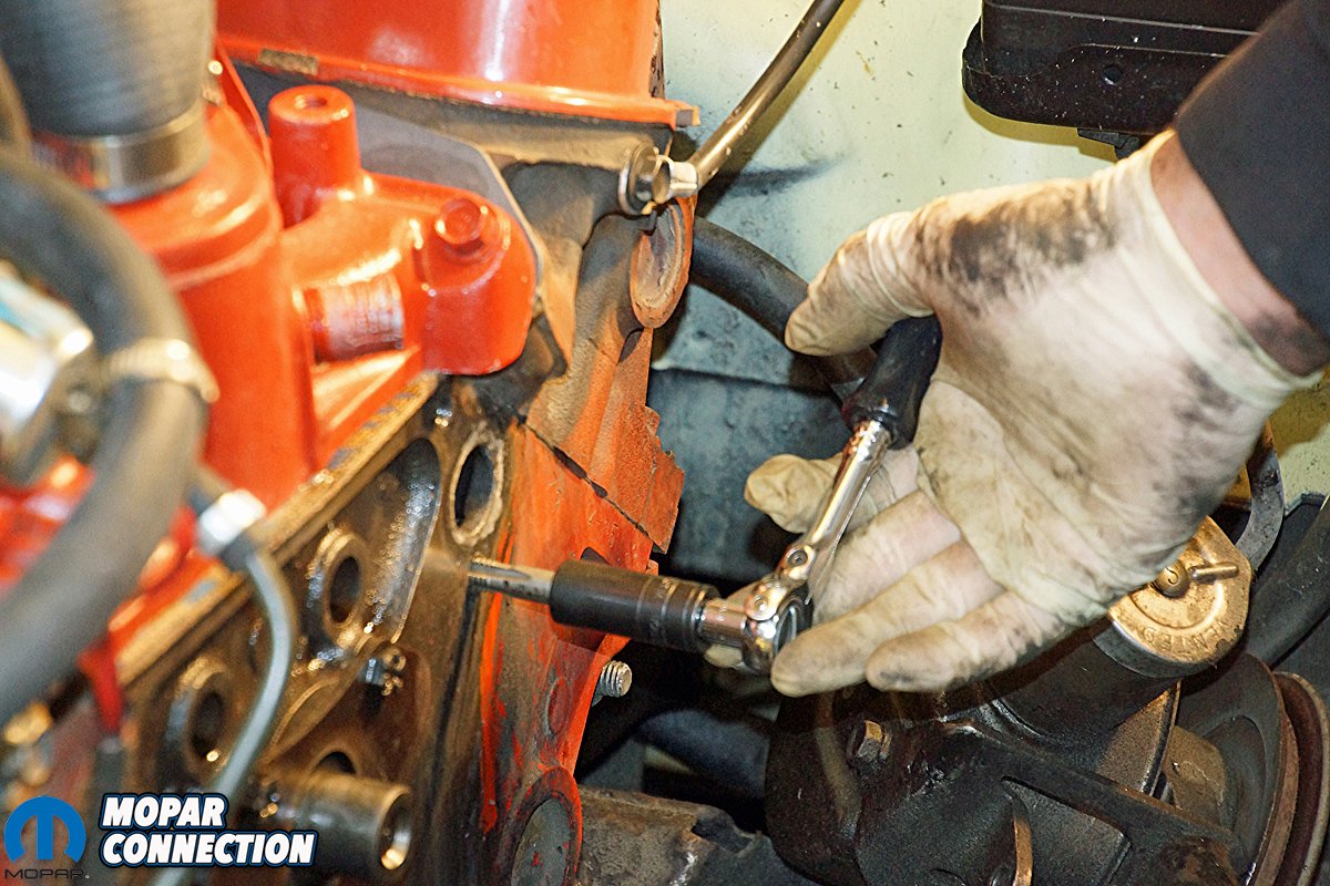 Above Left: Except for the alternator bolt, we cleaned and reused all the factory hardware. The alternator bolt was damaged (notched) from what looked like an overtightening of the alternator belt. This overtightened alternator belt could have been a contributor to the dyno test water pump failure as well. Above Right: The Cloyes timing chain tensioner installation proved to be worth the effort. At idle, the dial-back timing light strobe froze the harmonic TDC mark at 12° BTDC, and at 2800 rpm, the timing mark was stable at 36° BTDC. The timing was dead on and steady.