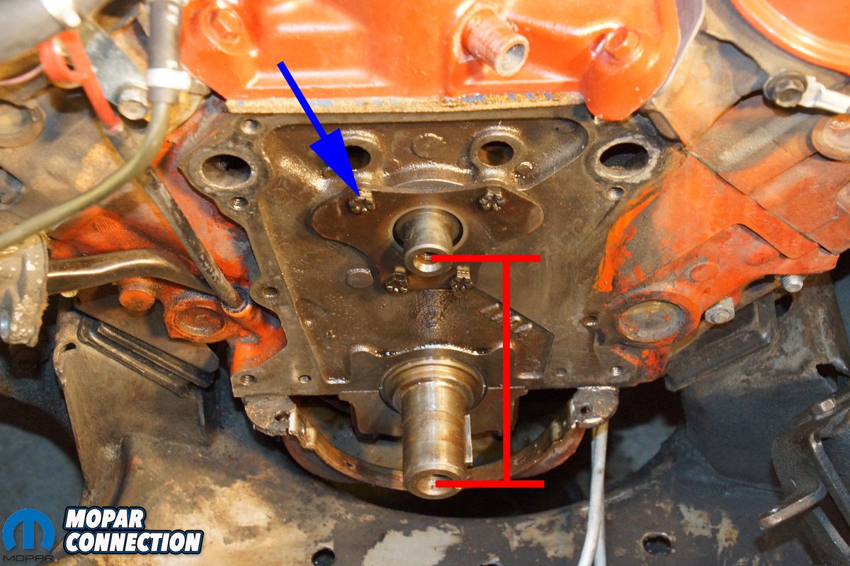 Above Left: Before we removed the cam retainer plate, we cleaned the gasket surfaces of the block and chased every bolt hole with a bottoming tap. To minimize the amount of debris falling into the engine’s oil pan, we stuffed several paper towels (not seen in photo) at the opening of the oil pan (where the front cover had been). Above Right: Many manufacturers consider the Mopar small-block a “raised cam” engine. With a center distance between the crank and cam snouts of 6.125-inches (red lines), the Mopar small-block outdistances the competition by well over an inch, and with several engines, more than an inch and a half. There are several advantages to this design, but a downfall is an extremely long timing chain, which tends to stretch, causing cam and ignition timing inaccuracies. Four bolts secured the cam retainer plate. This engine did not have a hollow oiler bolt (blue arrow).