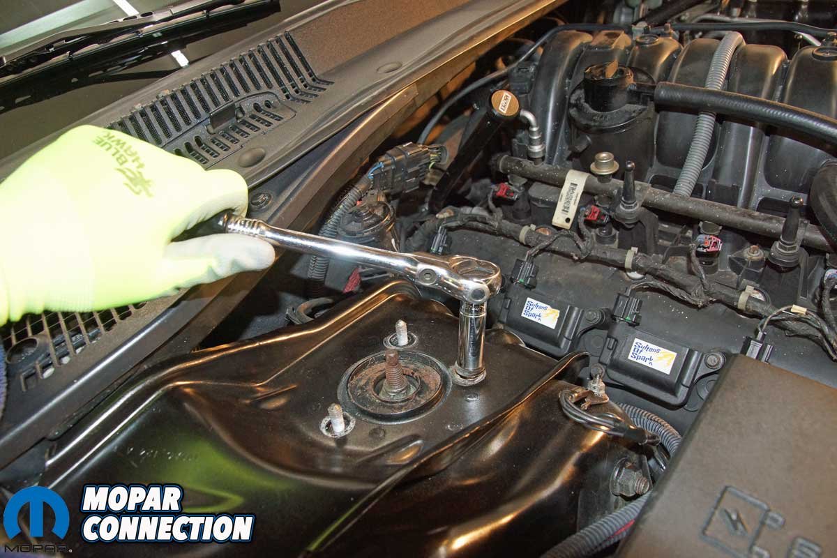 We started the installation of the strut brace by placing the Charger on a level flat surface as required by the instructions. The first step was to pull the engine cover from the Hemi. The factory strut tower covers were removed to access the strut fasteners. We unthreaded three 8mm nuts from each strut tower. There was zero chance of the struts popping loose with the Charger’s weight on the strut plates.