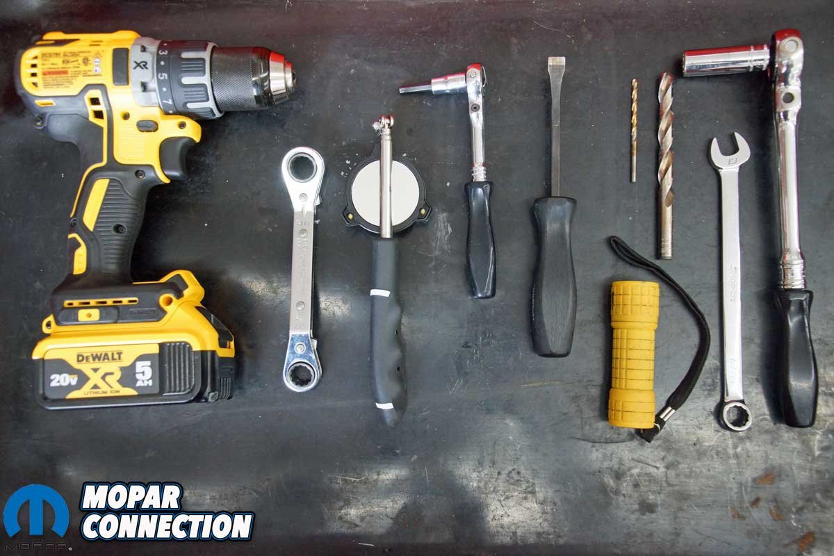 Above Left: The strut bar wraps nicely around the Hemi’s intake manifold and engine cover. Above Right: We needed all the tools photographed and two torque wrenches (not photographed) to complete the installation.