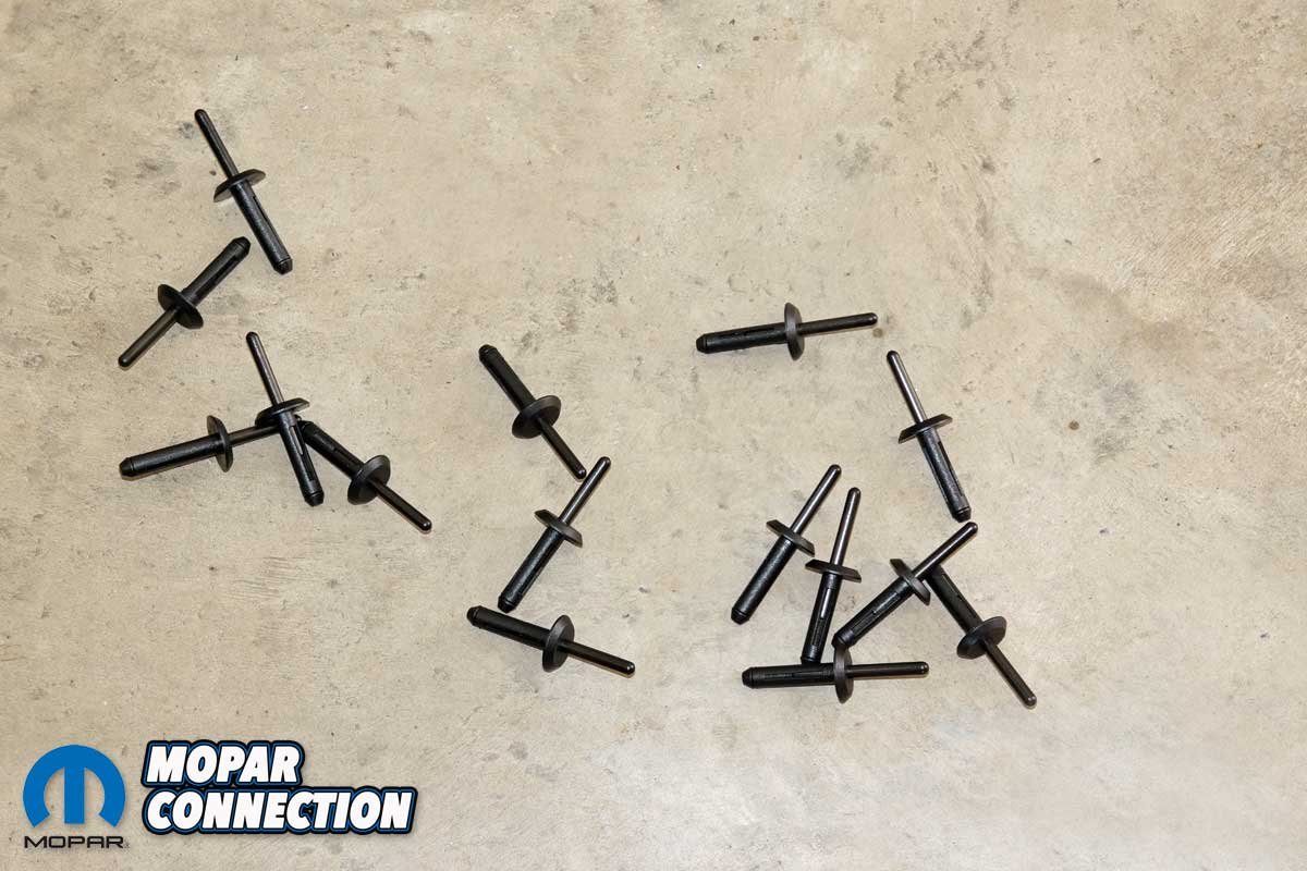 Top Left: The American Muscle chin spoiler is constructed from rugged ABS plastic to withstand minor shocks and abrasions. The spoiler is molded in black and ready-to-install, but it can be painted to match any color. Top Right: The spoiler requires special rivets to secure it to the bumper cover. The rivet’s body is pushed through a drilled hole, and then the pin is pulled. The pin movement causes the body to collapse, which provides the retention. Bottom Left: The chin spoiler kit requires twelve rivets, but American Muscle delivers a few extra fasteners. The extra rivets should not be necessary, but if a mistake is made and one is damaged during installation, you will have a replacement or two. Bottom Right: The spoiler had four adhesive strips attached to the support bracket. Two strips were at the center of the spoiler, and two were closer to the spoiler’s ends.
