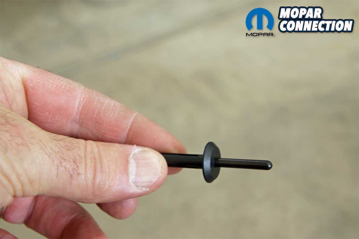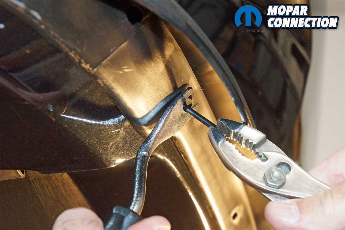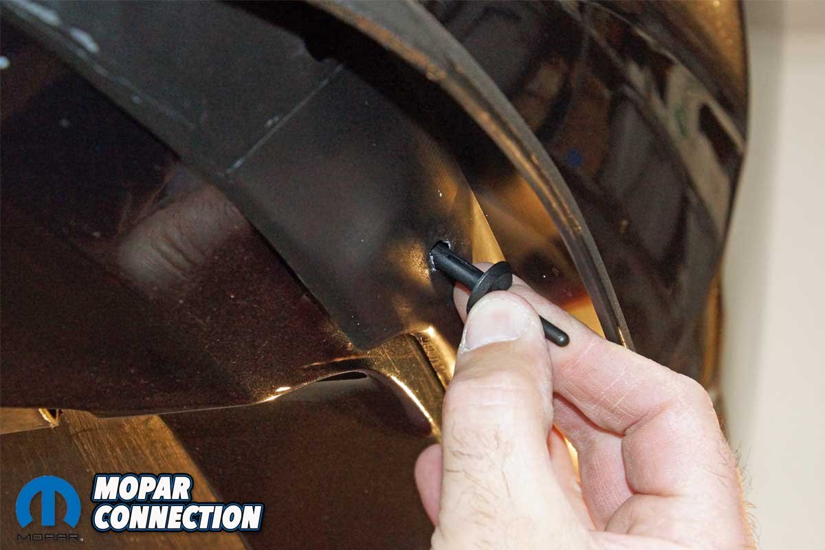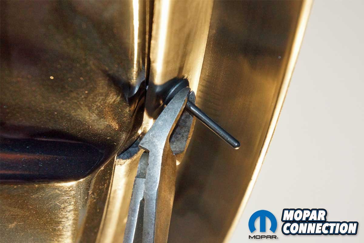 Using a door trim tool to support the rivet head, we pulled the center pin with a pair of pliers. The pulling action caused the rivet to collapse, which provided a secure connection between the spoiler and the bumper cover. The second rivet was supported and pulled tightly in the same fashion as the first.