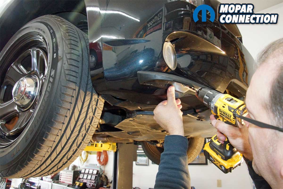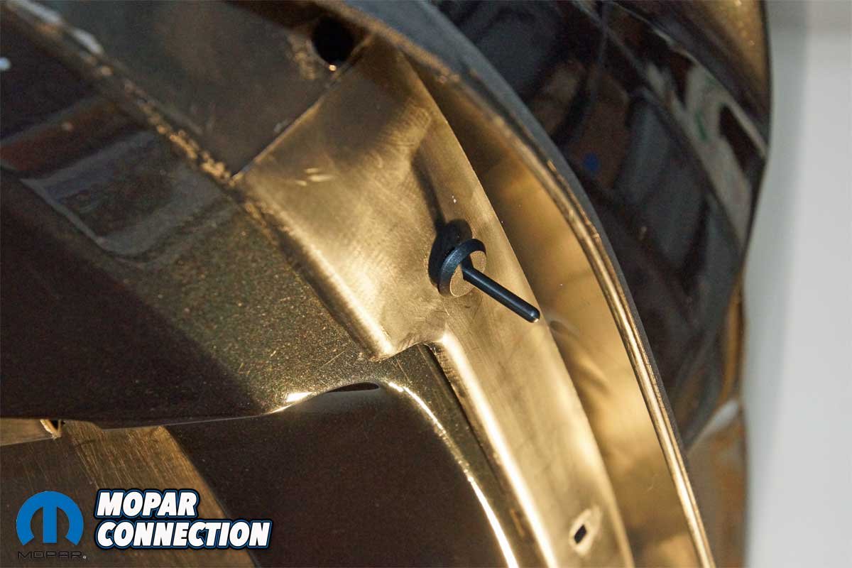 Satisfied with the location and the fit of the spoiler, we removed the masking tape and peeled back the two adhesive strips closest to the center of the spoiler. We realigned the spoiler and pressed the strips firmly against the bumper cover. Using a ¼-inch drill bit, we drilled through the center-most mounting holes. A plastic rivet was pushed through each hole.